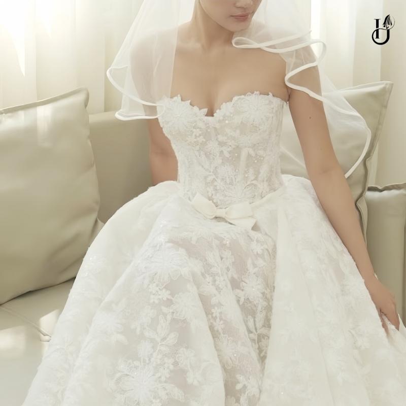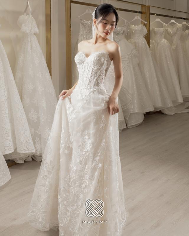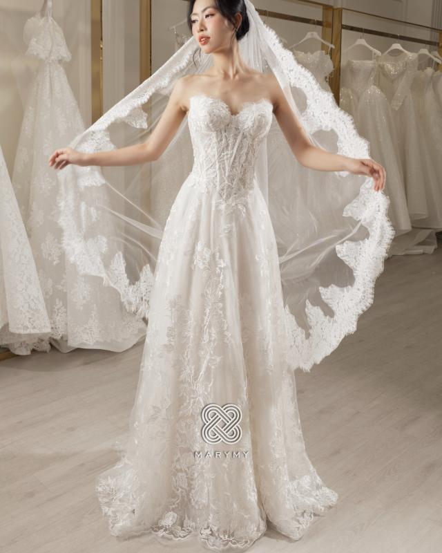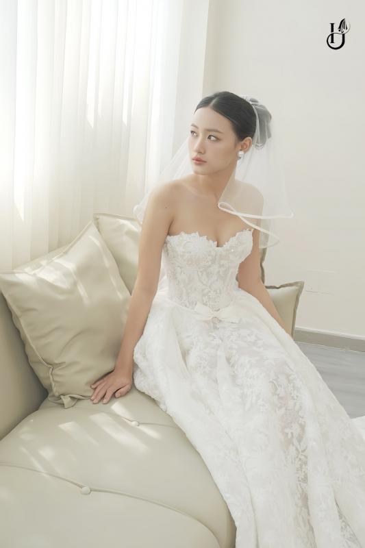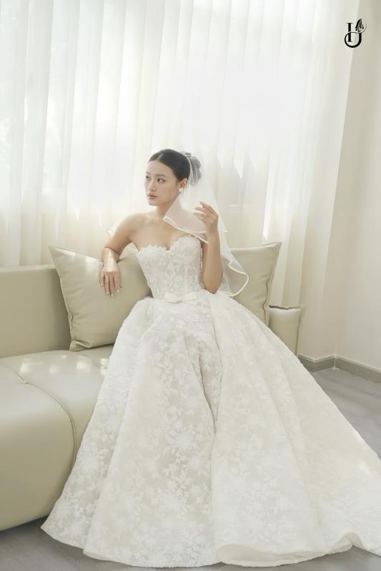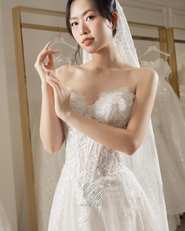 Chiếc váy mở ra một khoảnh khắc rất khẽ, nơi cô dâu được bao bọc trong sự mềm mại và ngọt ngào. Phom dáng cổ điển, chất liệu ren tinh tế gợi nên vẻ đẹp tự nhiên một cách trọn vẹn, không cần phô bày.