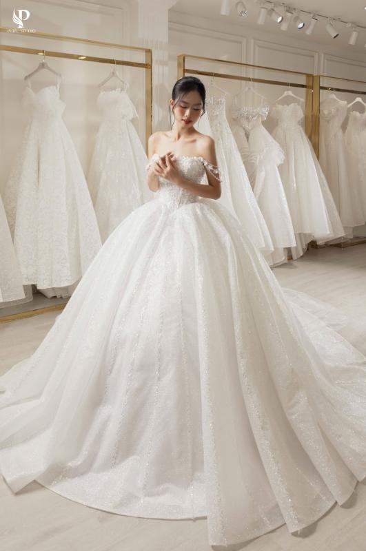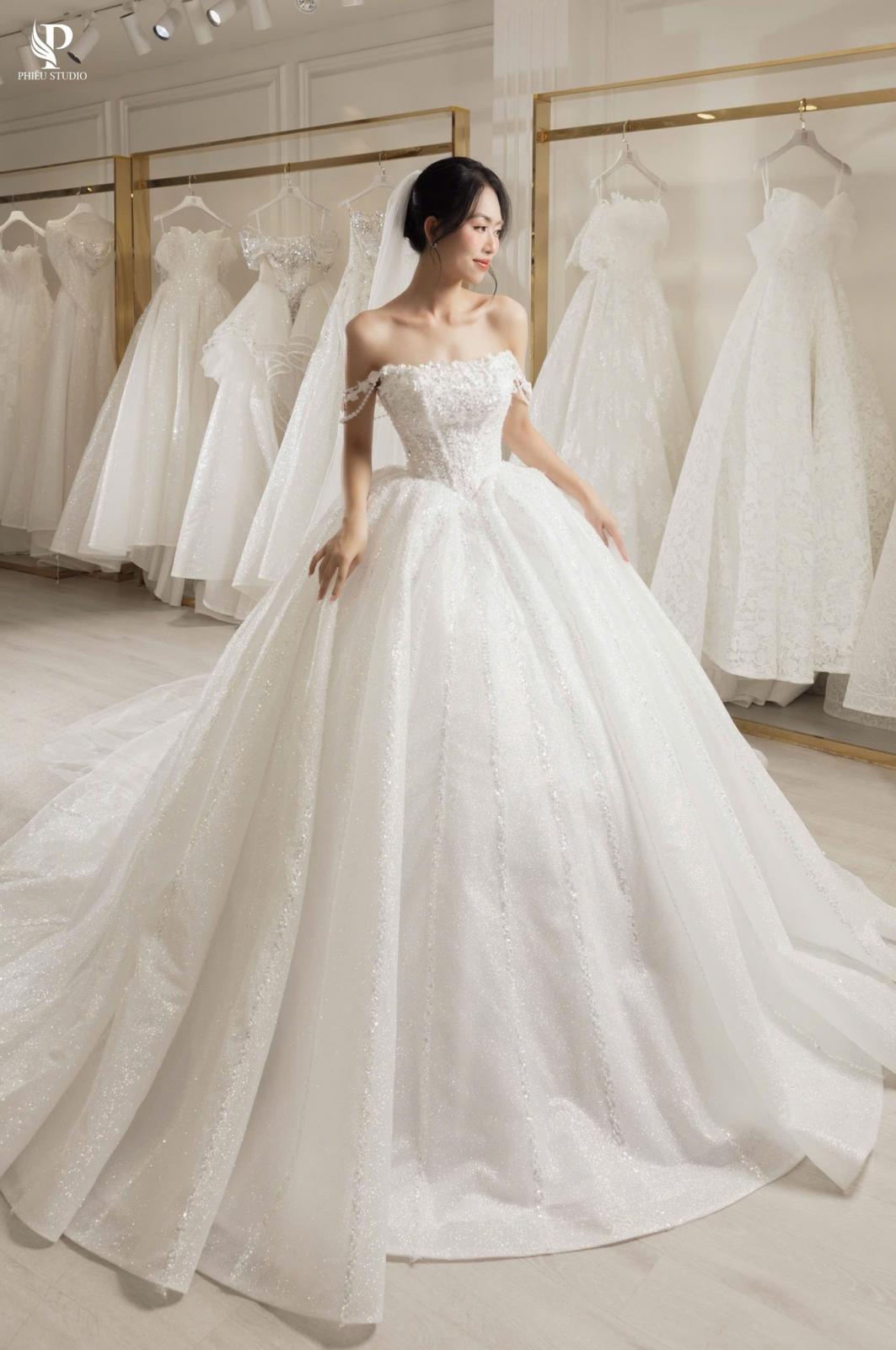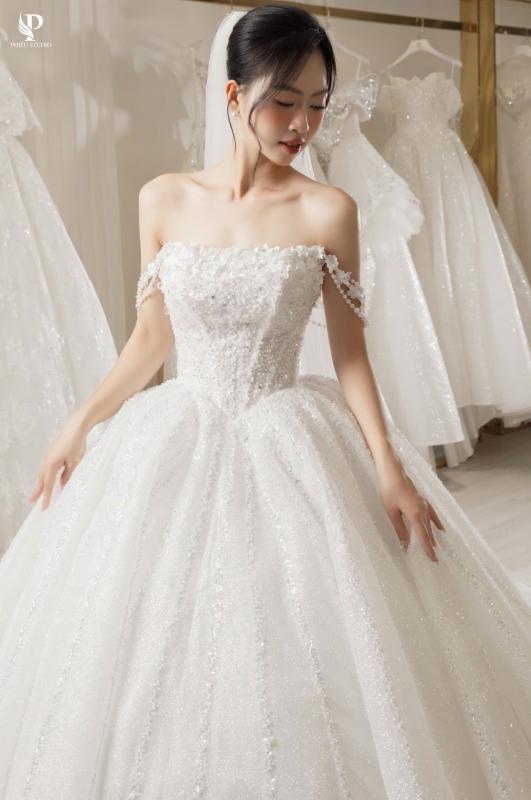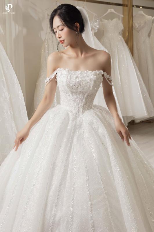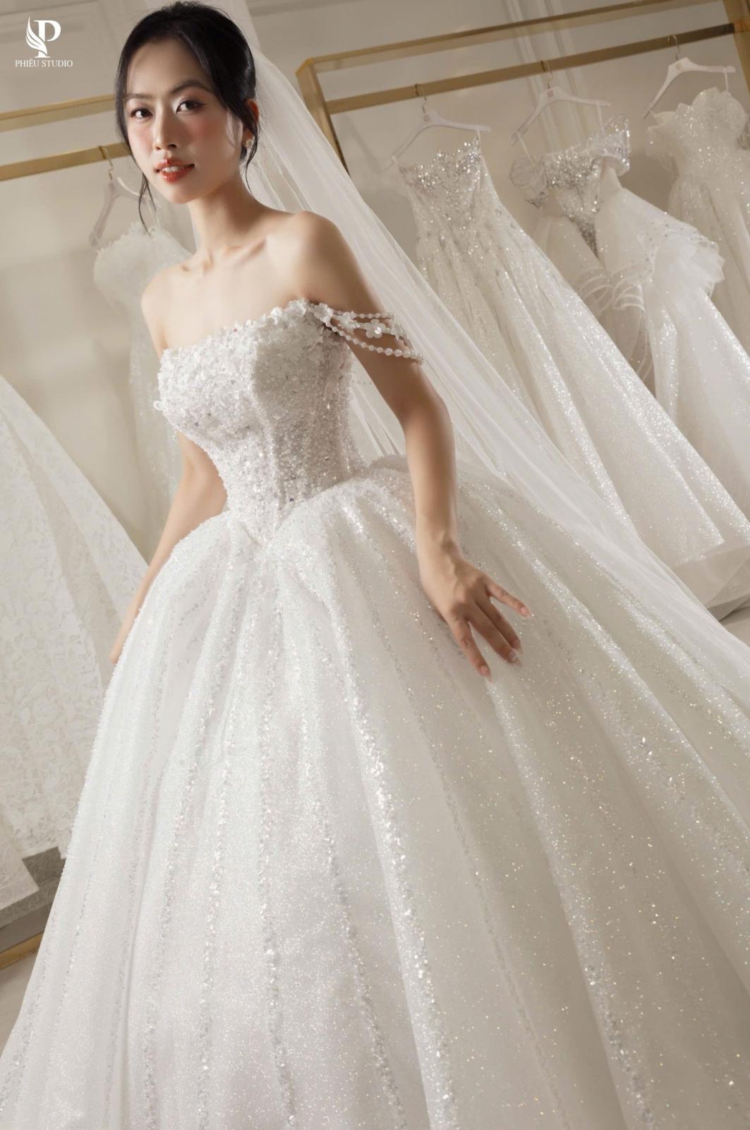Venessa mang phom dáng ball gown cổ điển, nổi bật với phần chân váy xòe rộng mềm mại, tạo nên vẻ bồng bềnh thanh thoát như một nàng công chúa hiện đại.