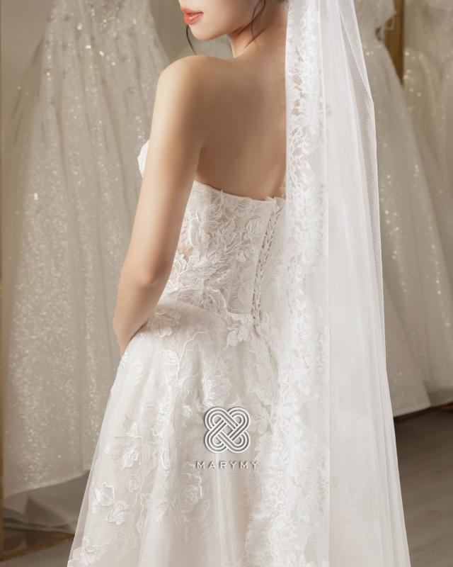 The essence of this design is its ethereal lightness, a breathtaking symphony of translucent layers and botanical artistry. MARYMY presents a gown that prioritizes movement, where a structured, semi-sheer bodice serves as the heart of a blooming landscape. The sweetheart neckline is delicately traced with hand-cut lace vines, which appear to grow organically across the corset, creating a rich, multi-dimensional texture that feels alive.