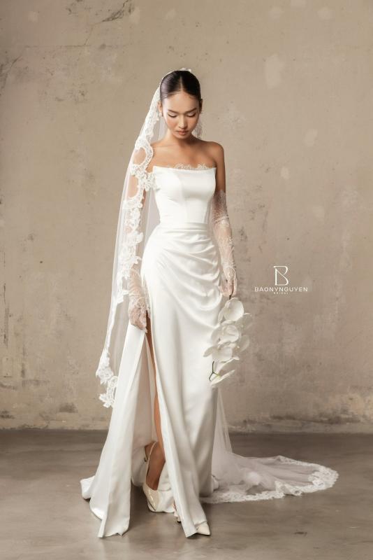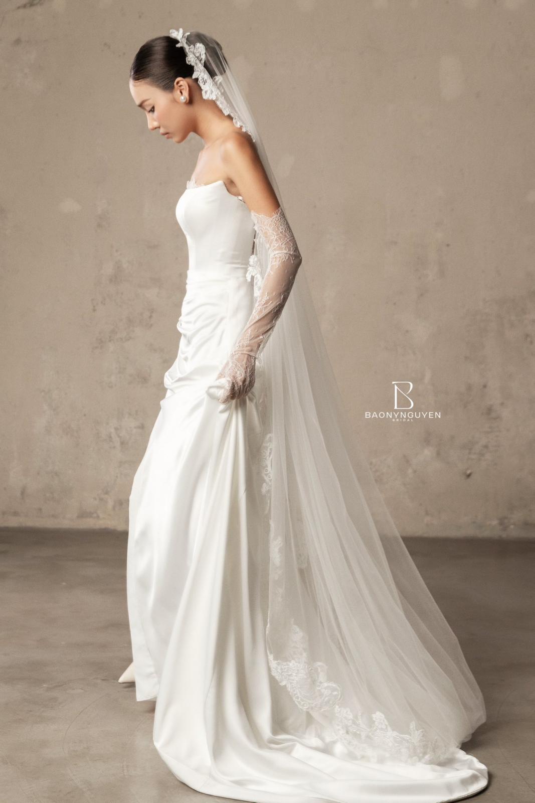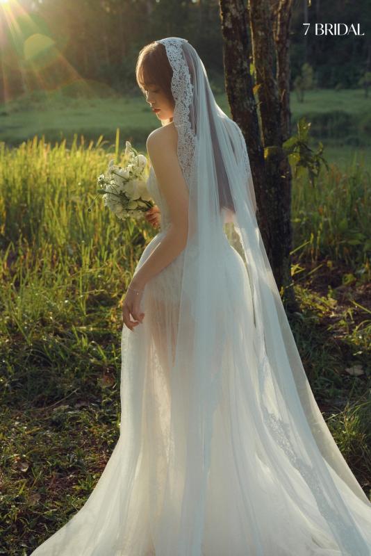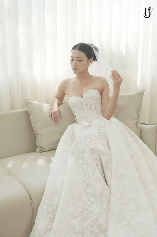 Thiết kế không cần nhiều chi tiết, nhưng vẫn đủ chiều sâu để tôn lên thần thái cô dâu - một vẻ đẹp nhẹ nhàng, sang trọng và bền vững theo thời gian