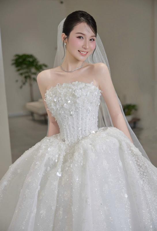 Thiết kế cúp ngực ôm gọn phần thân trên, tôn xương quai xanh và bờ vai thanh mảnh. Phom ball gown bồng bềnh kết hợp lớp đính kết ánh kim lấp lánh giúp từng bước di chuyển đều bắt sáng hoàn toàn.