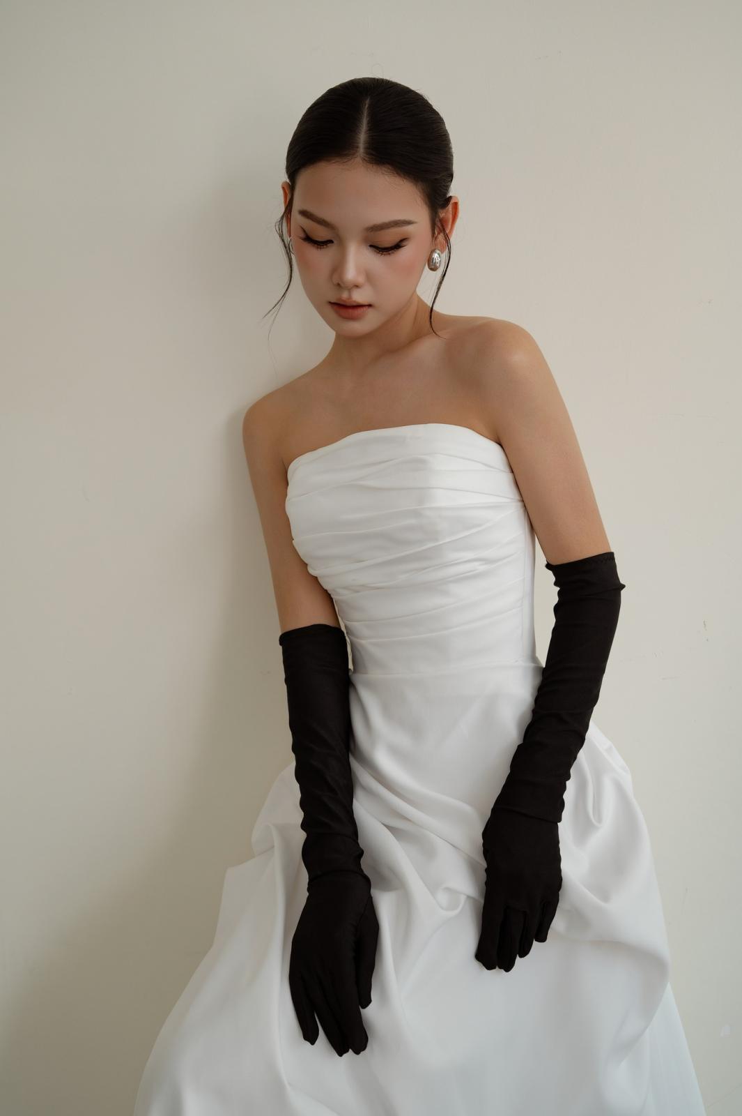 Thiết cúp ngực tối giản, ôm gọn phần thân trên giúp tôn dáng cực kỳ tinh tế. Phần chân váy xếp nếp mềm mại tạo độ bồng vừa đủ, nhìn sang mà không hề rườm rà.
