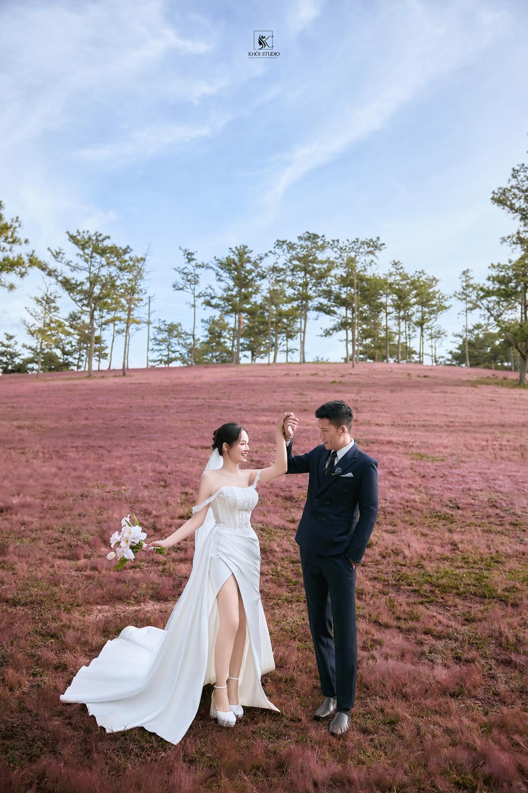 Ảnh cưới ở đồi cỏ hồng - Photo by Khôi Studio