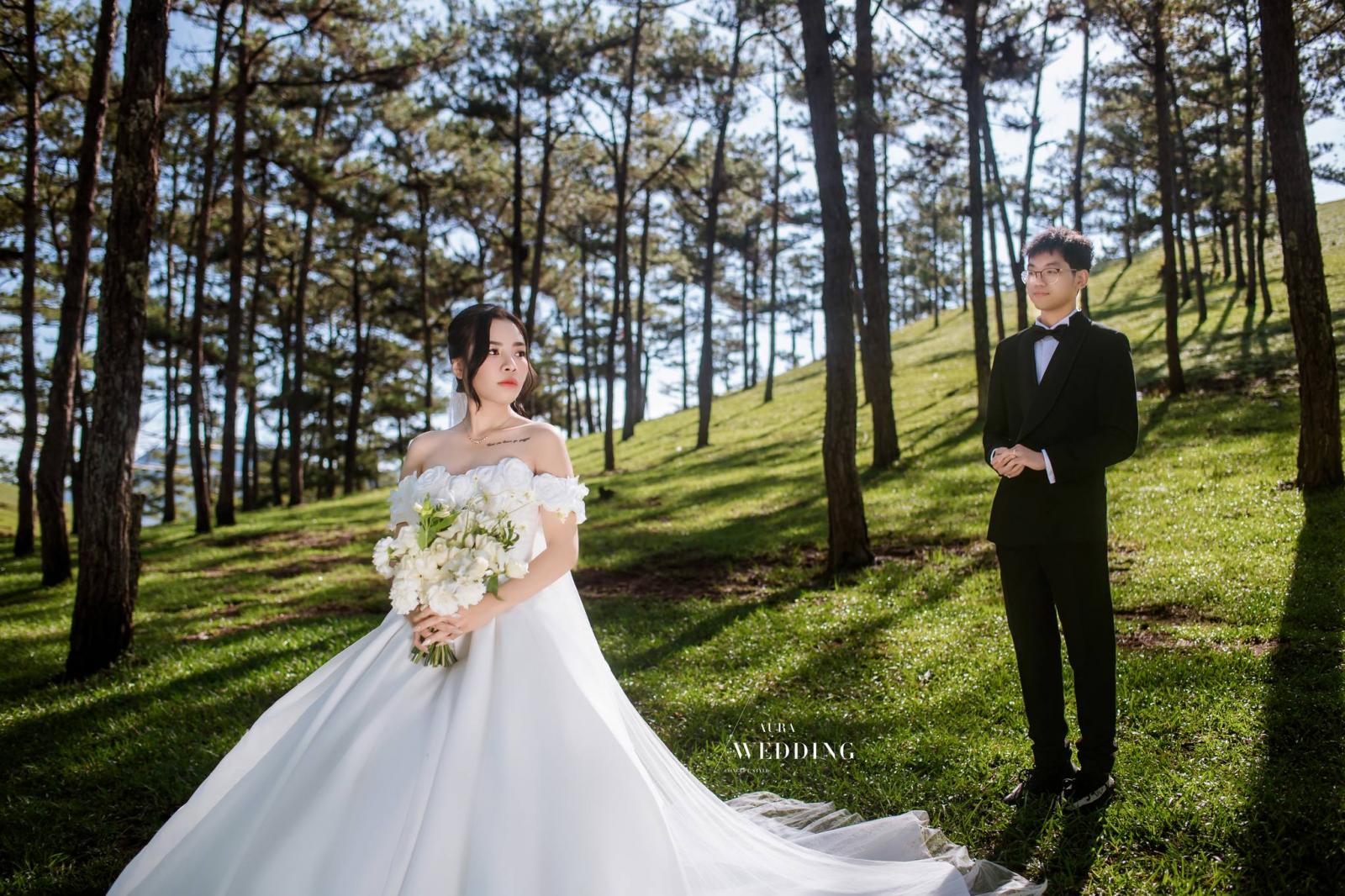 Những shoot hình cưới tại rừng thông Đà Lạt thật lãng mạn và kỳ ảo. Cặp đôi hòa mình vào khung cảnh thiên nhiên tĩnh lặng, những hàng thông cao vút tạo nên bức tranh thơ mộng. Ánh nắng xuyên qua tán lá nổi bật tình yêu trong từng khoảnh khắc