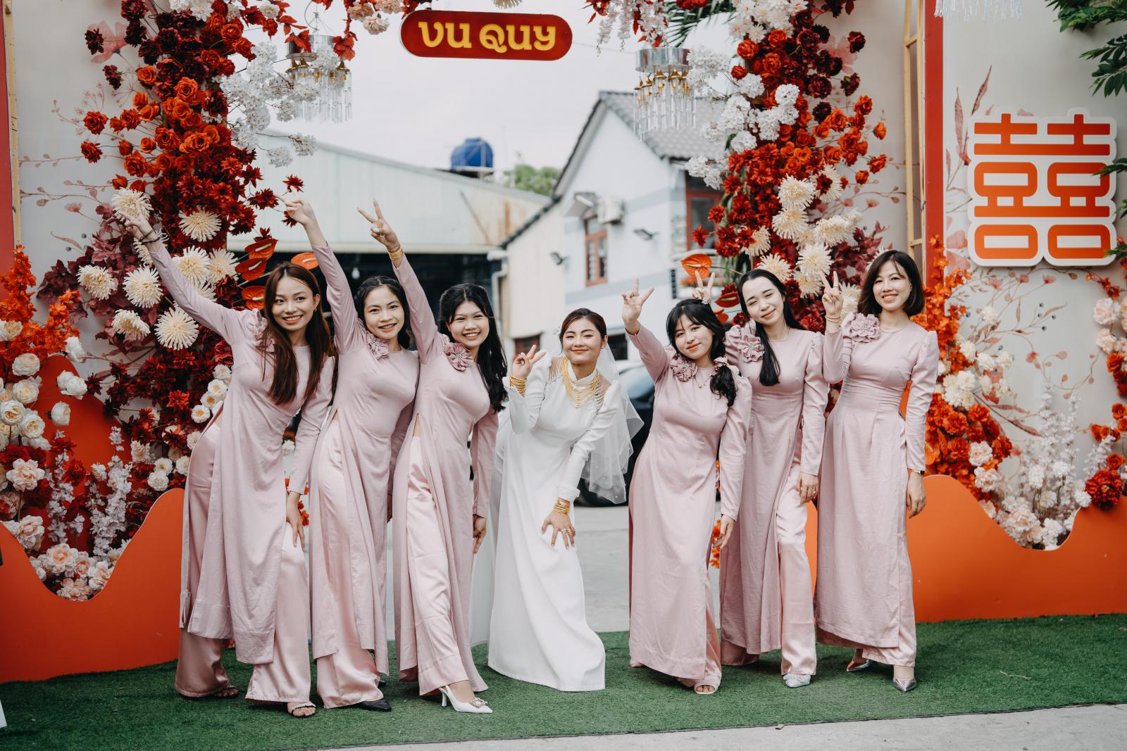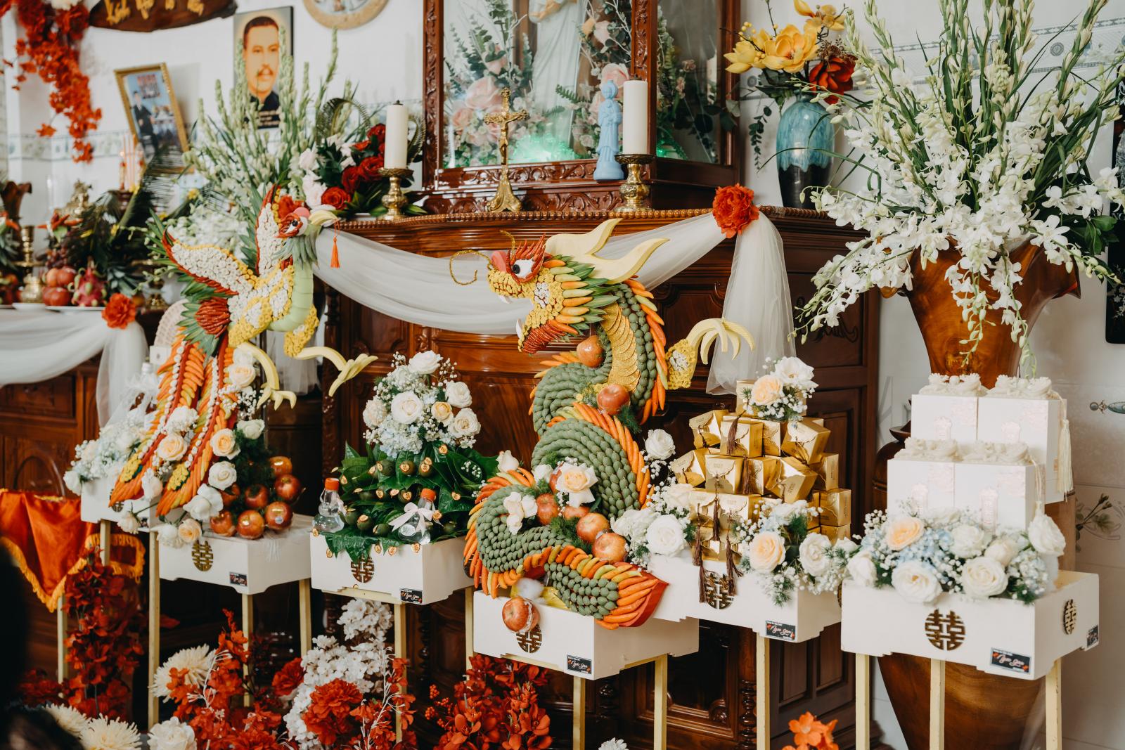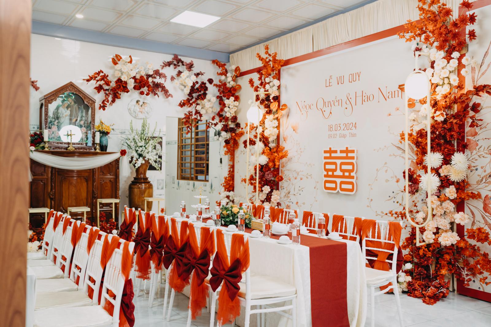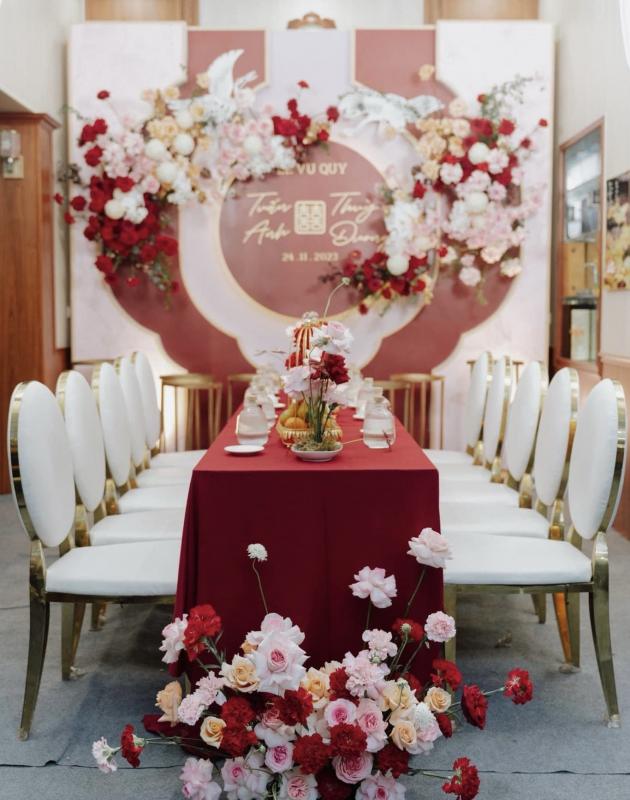 Một trong những tone màu được đại đa số cặp đôi yêu thích & lựa chọn cho gia tiên của mình chính là tone đỏ - tone màu truyền thống. Với background được trang trí đầy hoa, kết hợp cùng các tone màu đỏ, trắng, mix chút cam,... sẽ là lựa chọn vô cùng tuyệt vời để những bức ảnh làm lễ gia tiên thêm rực rỡ.