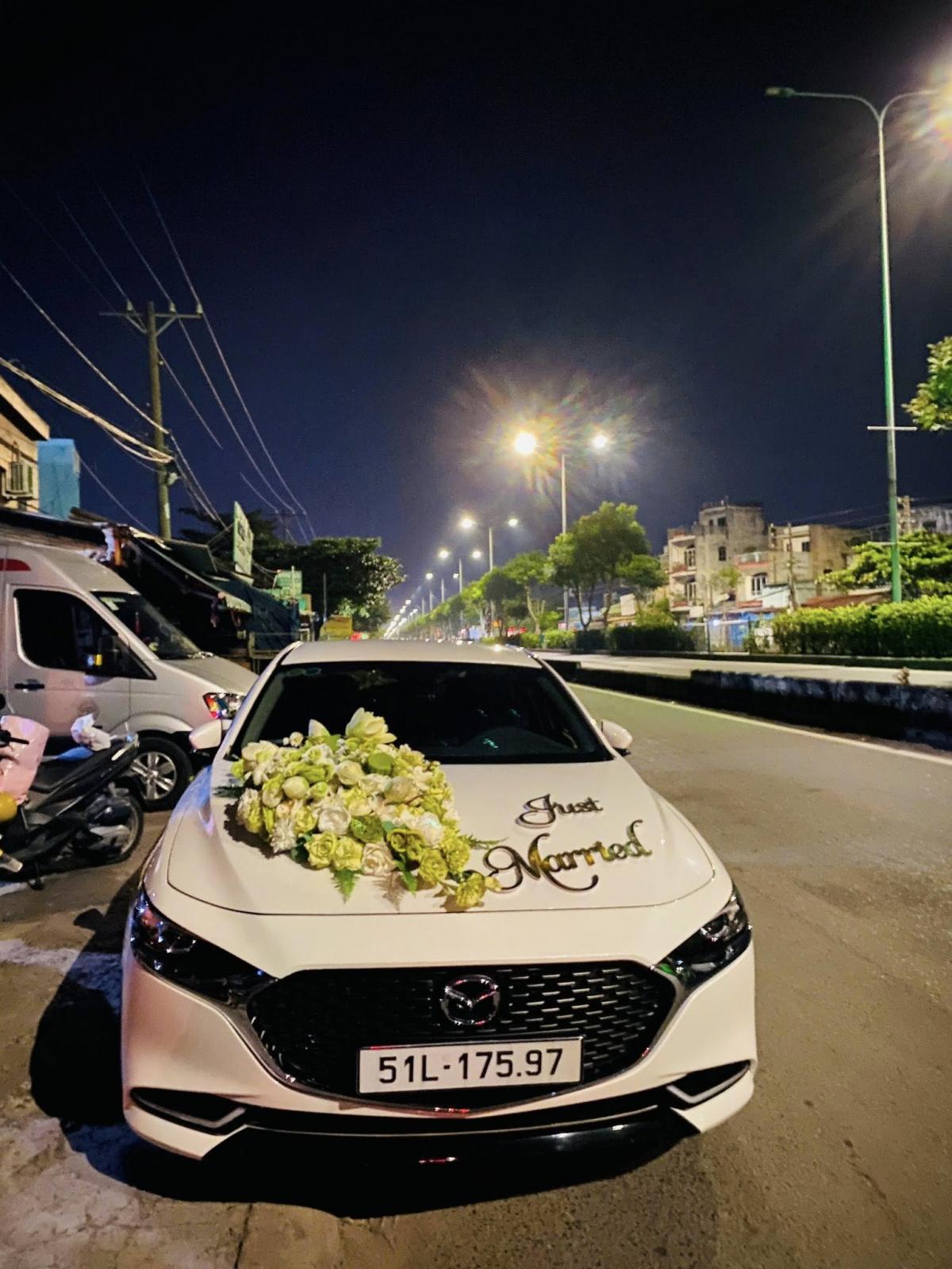 Chiếc Mazda 3 màu trắng ngọc trai đời 2024-2025 được chọn làm xe cưới chính.