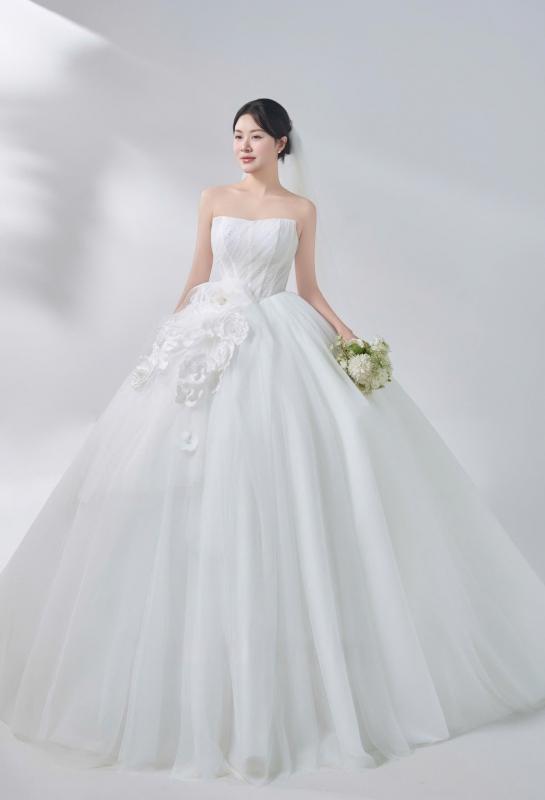 Như lời tuyên ngôn riêng về phẩm chất và cả tính của một nữ hoàng HongKong đem đến thiết kế ball-gown với dáng xoè rộng cùng những đường xếp ly tinh tế và lấp lánh khéo léo tôn lên hình ảnh cô dâu thật lộng lẫy trong ngày trọng đại.