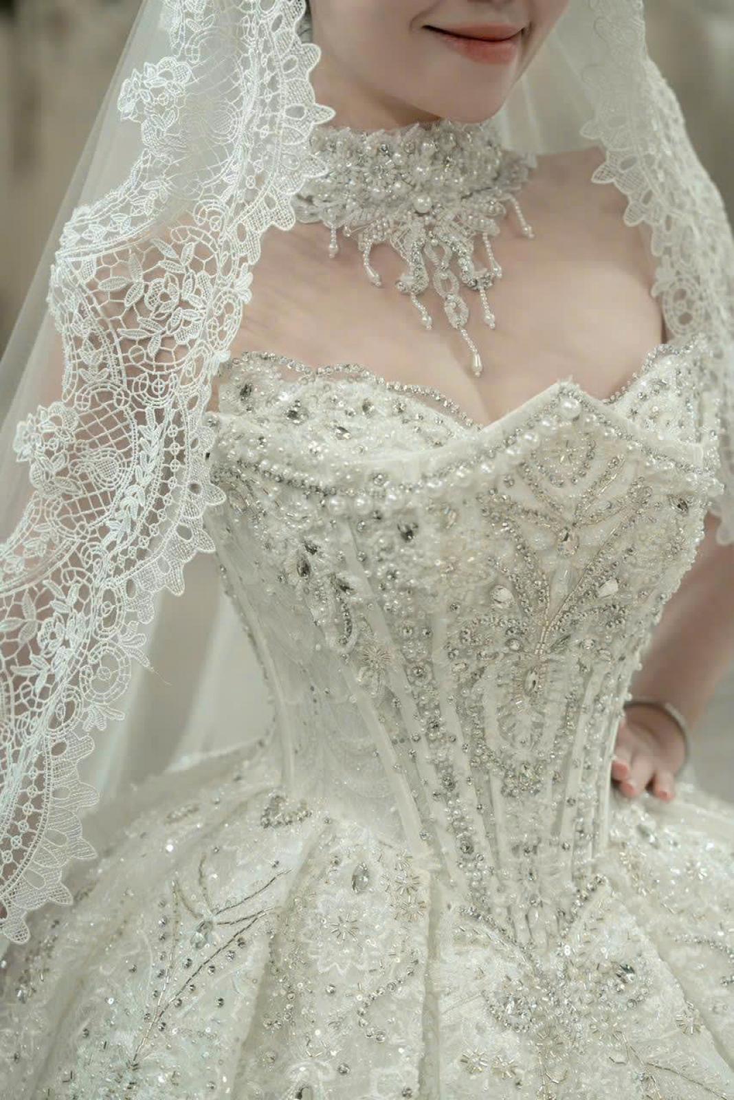 Mẫu váy gây ấn tượng khi sử dụng form dáng corset được đính đá thủ công tỉ mỉ, với điểm nhấn chocker và găng tay đồng bộ tạo nên sự quyến rũ khác biệt khi vừa thời thượng lại vô cùng sang trọng.
