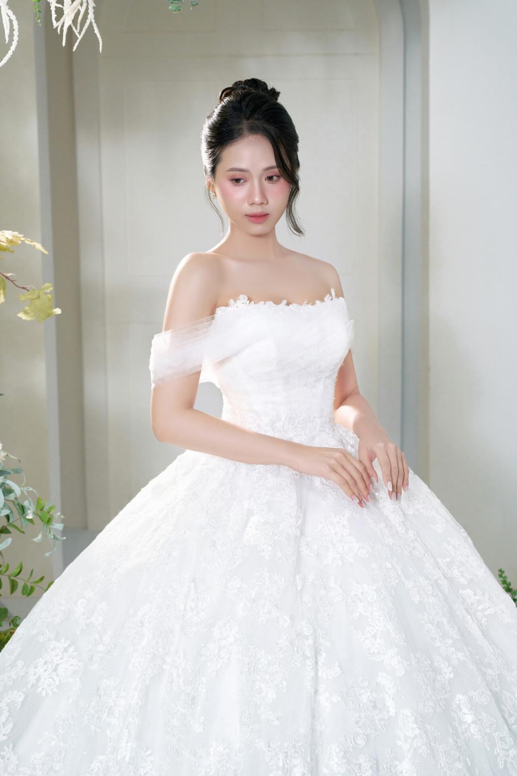 Ẩn sau mỗi lớp ren chính là sự ẩn hiện đầy lung linh, bao bọc lấy nàng như một vầng hào quang. Với Look 1, nàng không chỉ mặc một chiếc váy cưới, mà đang khoác lên mình một thiết kế mang đầy chiều sâu và đáng nhớ trong từng bước đi.