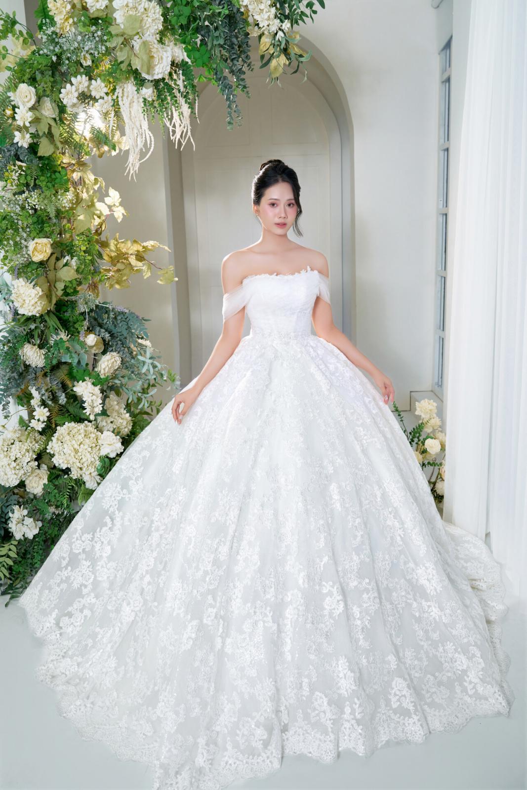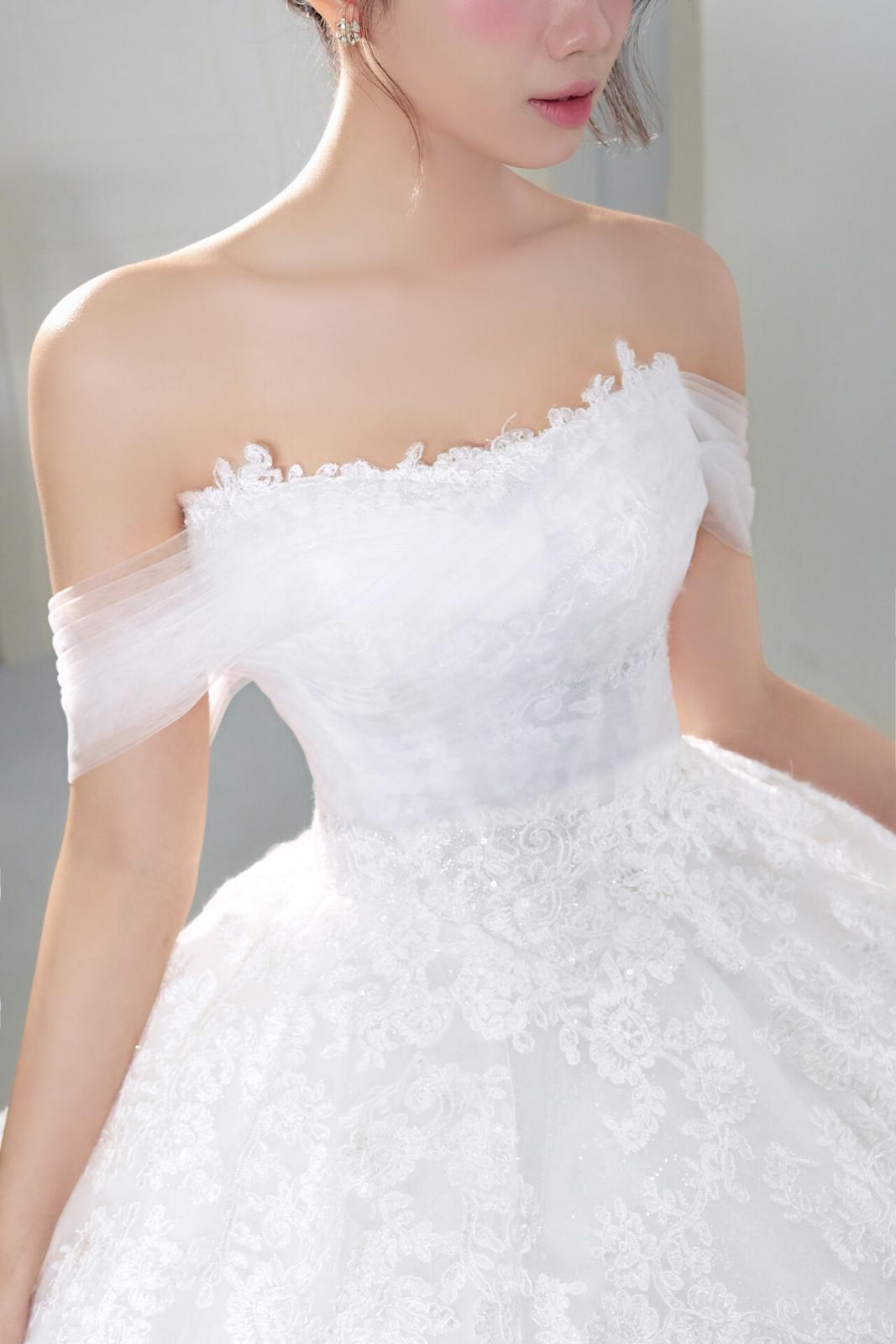Từng đường nét thiết kế được tính toán tỉ mỉ, từ bờ vai trễ mềm mại đến thân áo corset ôm khít, kiến tạo nên một đường cong tuyệt mỹ. Chất liệu ren Chantilly cao cấp bao phủ lên thân váy, mang theo hơi thở của những giá trị thủ công tinh xảo nhất đến từ HongKong Luxury.