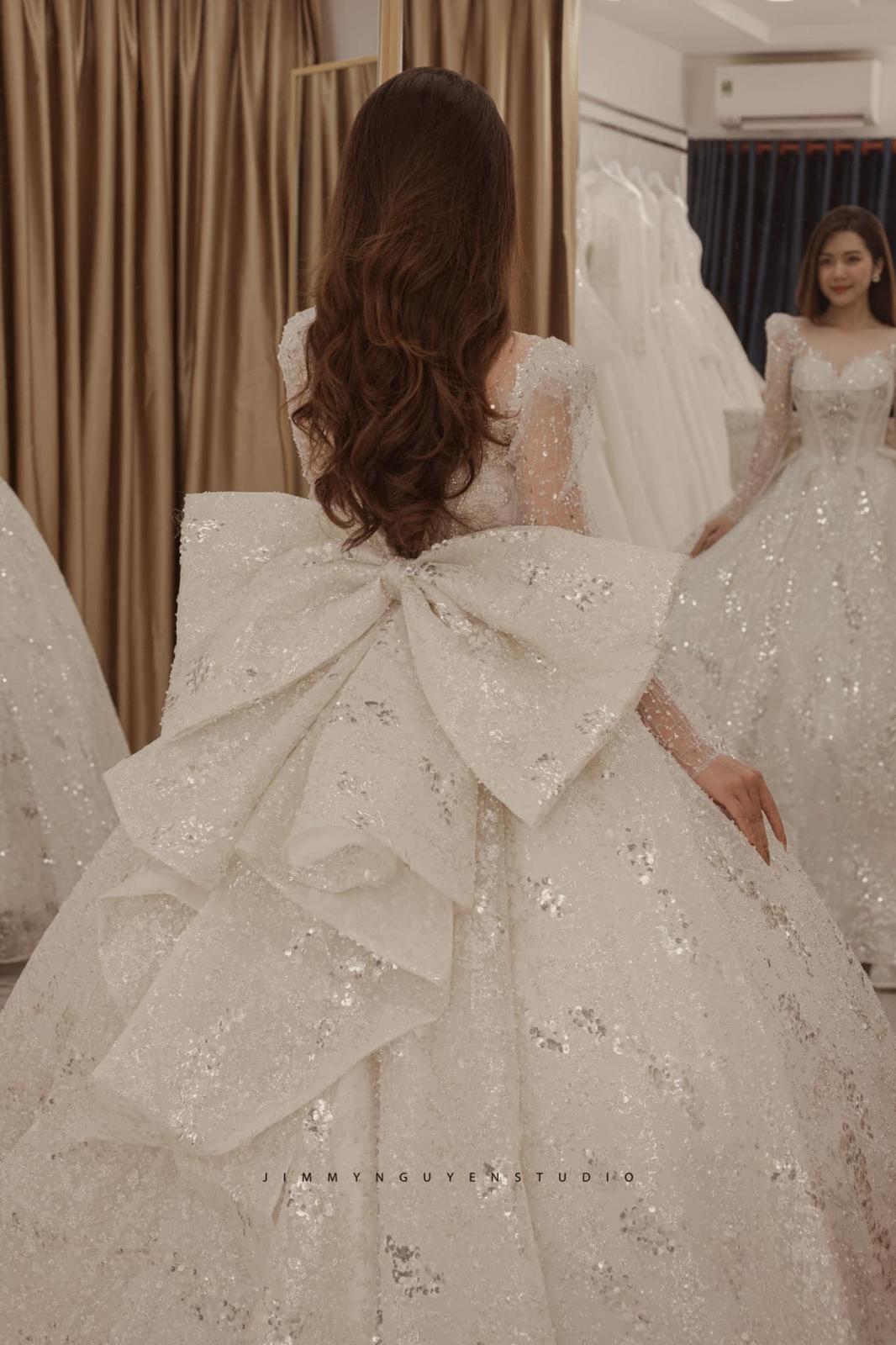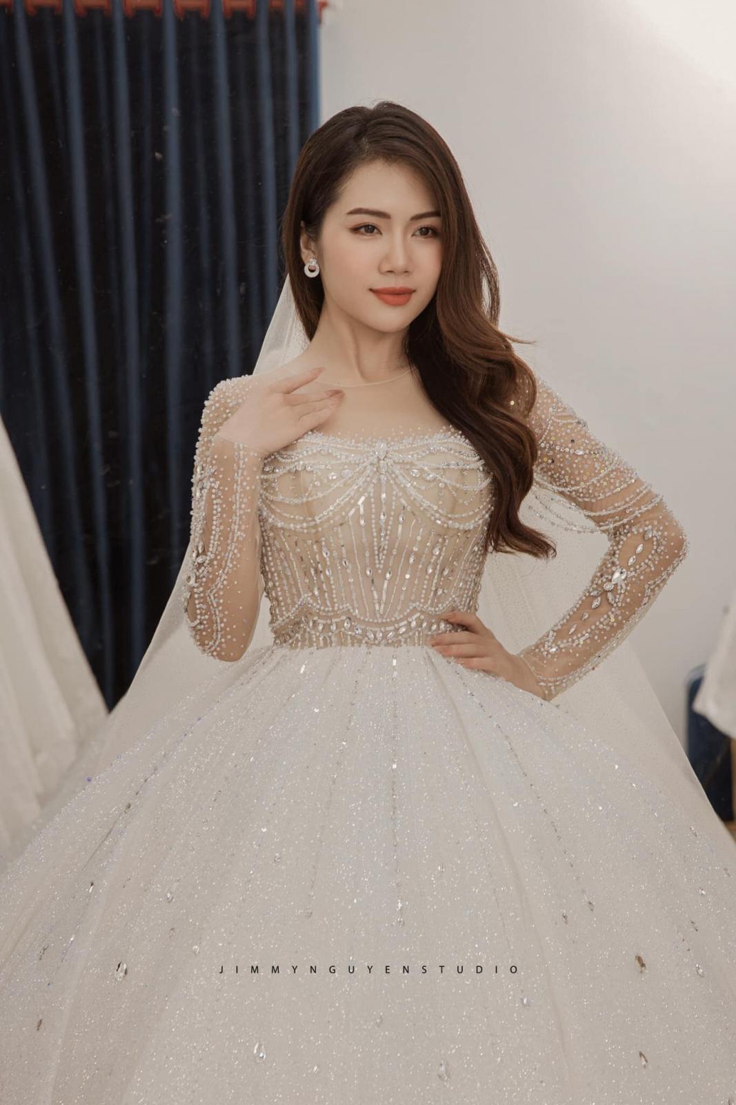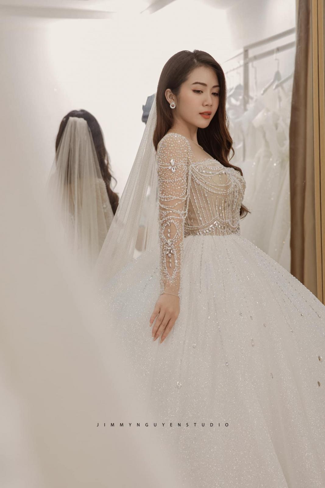 Chiếc váy cưới được đính kết tỷ mỹ kim sa và ngọc trai là món quà Jimmy Nguyen Wedding Studio muốn gửi đến các nàng dâu.