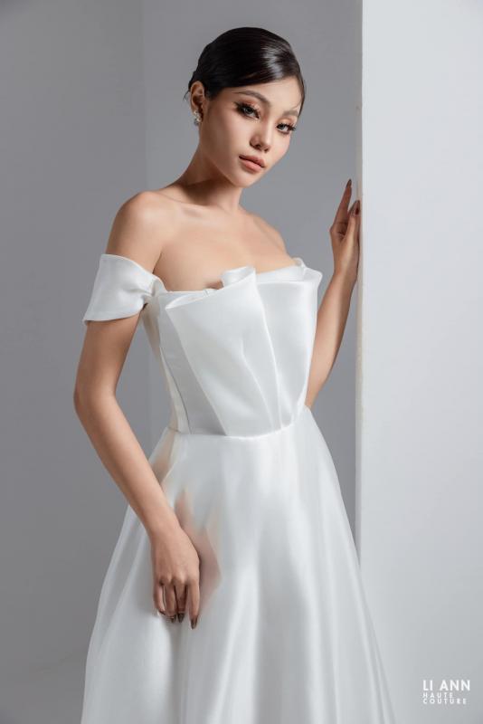 Thiết kế off-shoulder mềm mại tôn lên đôi vai thon thả mà vẫn giữ được nét dịu dàng, thanh thoát. Cấu trúc ôm sát ở thân trên kết hợp những đường gấp nếp tinh tế trên nền vải tơ organza với độ bóng mờ, tạo cảm giác mềm mại và sang trọng, uyển chuyển theo từng bước di chuyển của nàng dâu.
