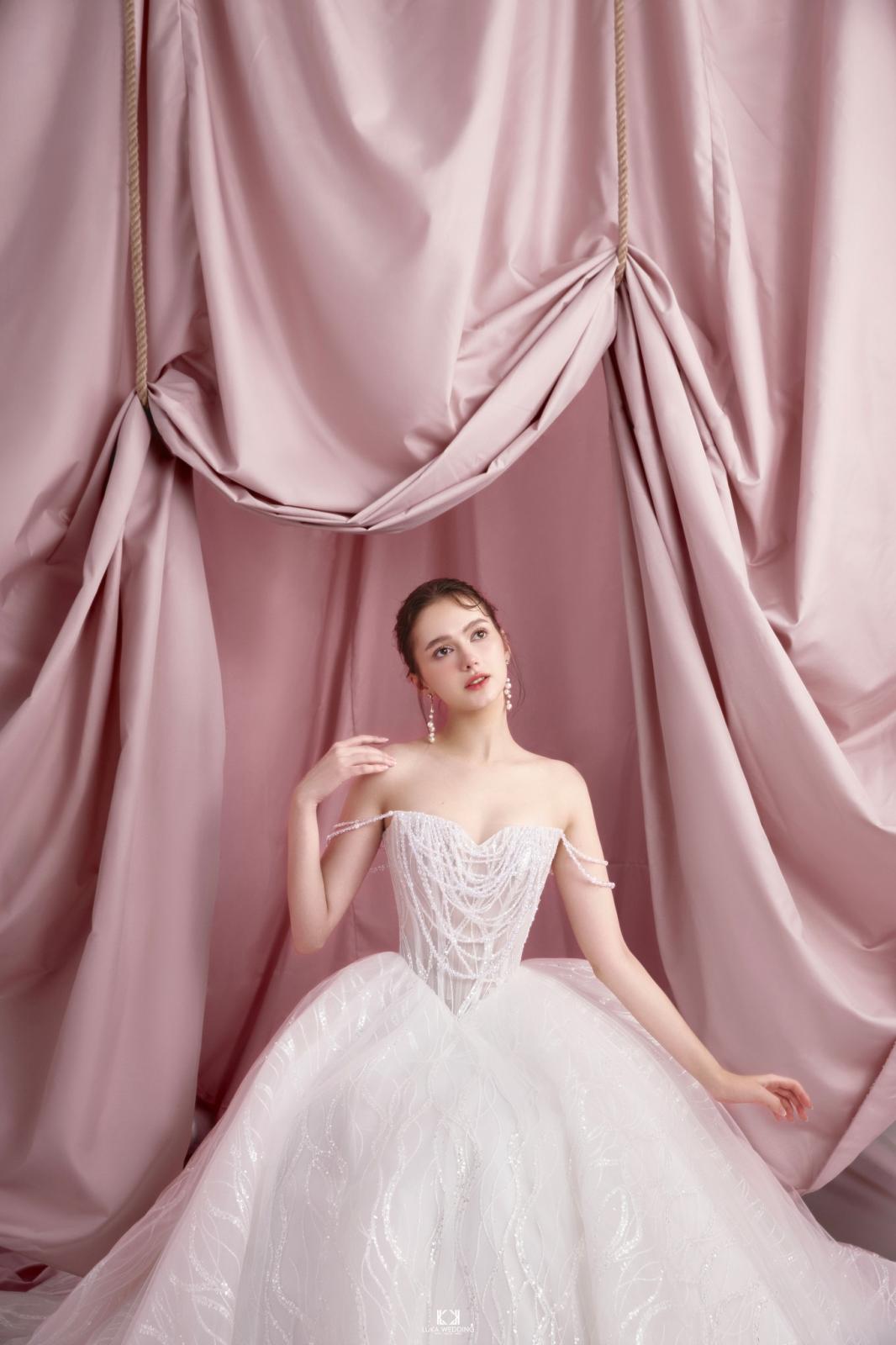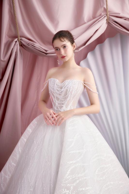 Nằm trong bộ sưu tập 𝑇ℎ𝑒 𝐺𝑙𝑜𝑟𝑦, chiếc váy cưới Pearl Dress là tập hợp của nét đẹp mơ màng cùng sự cao quý bậc nhất. Với thiết kế straight-cross vừa vặn ôm sát thân người đã giúp nàng khoe trọn vòng eo nhỏ xinh mềm mại của mình. Điểm nhấn của chiếc váy nằm ở những hạt ngọc được đính kết độc đáo tạo thành những đường chuỗi hạt rũ xuống một cách tinh tế. Pearl Dress nhìn trông có vẻ như một chiếc váy hai dây, cho đến khi khoác lên người, dây áo buông rũ xuống hai bên vai đã làm cho thiết kế vừa trở nên ấn tượng vừa hoàn toàn lột tả được vẻ đẹp đến từ bờ vai trần đầy gợi cảm của nàng.