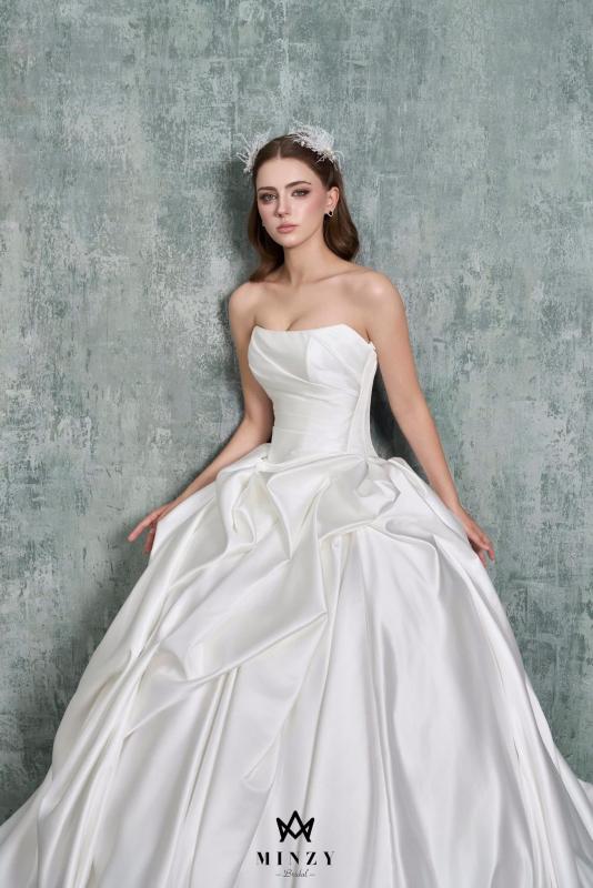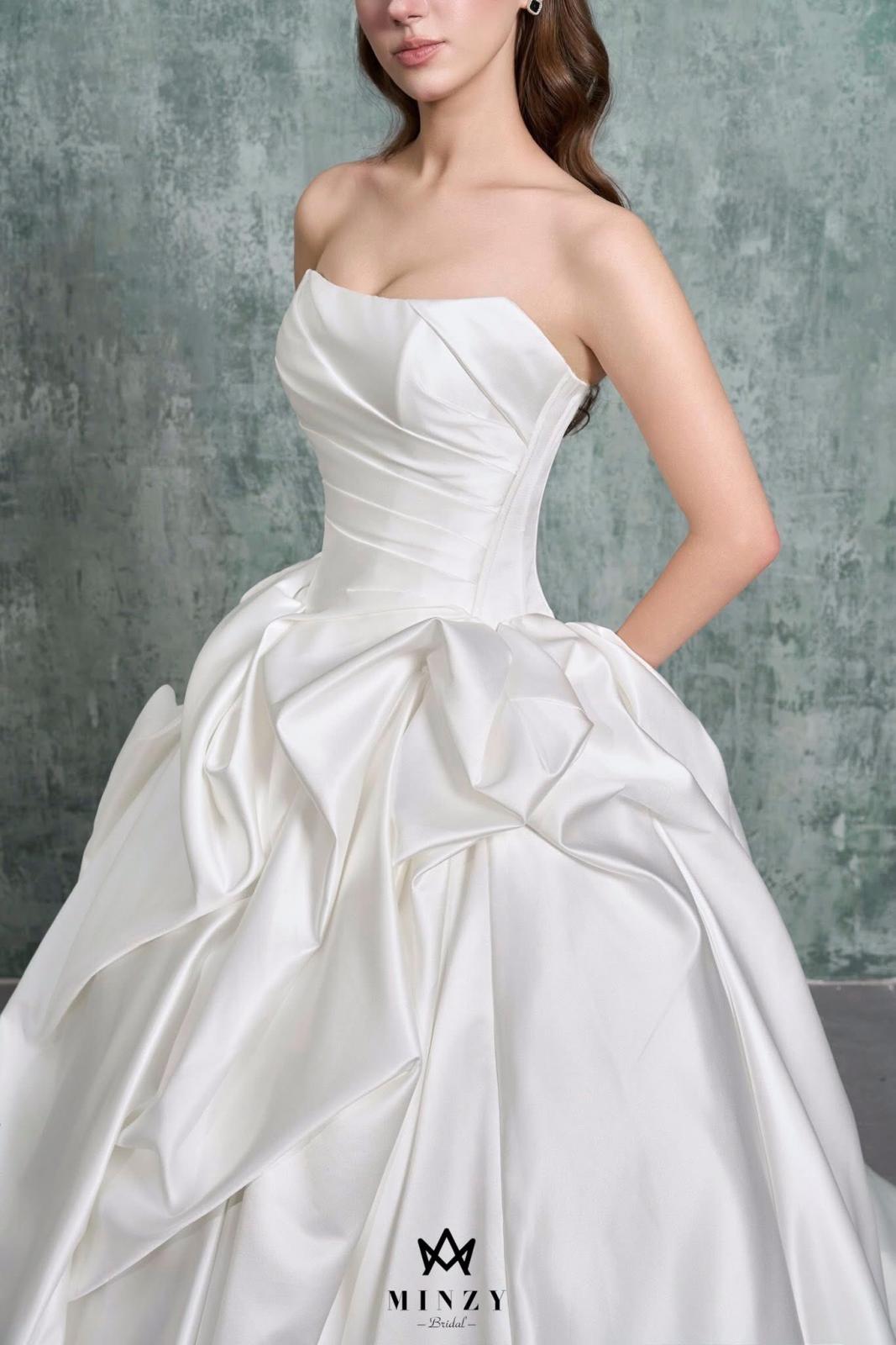 Mẫu váy cưới cúp ngực dáng ball gown là lựa chọn hoàn hảo cho cô dâu yêu nét tinh giản nhưng đầy quyền lực. Phần thân trên được xử lý gọn gàng, tôn bờ vai và xương quai xanh thanh tú, kết hợp cùng chân váy phồng lớn với những nếp draping mềm mại, tạo nên hiệu ứng sang trọng và cuốn hút trong từng bước đi.