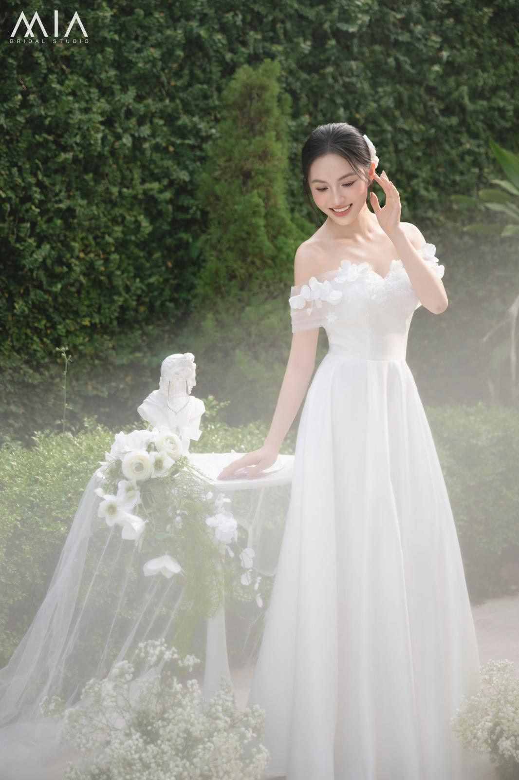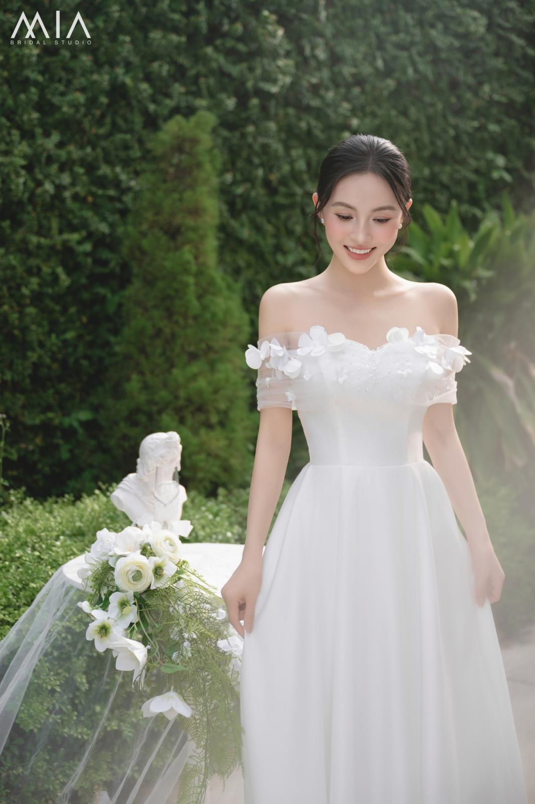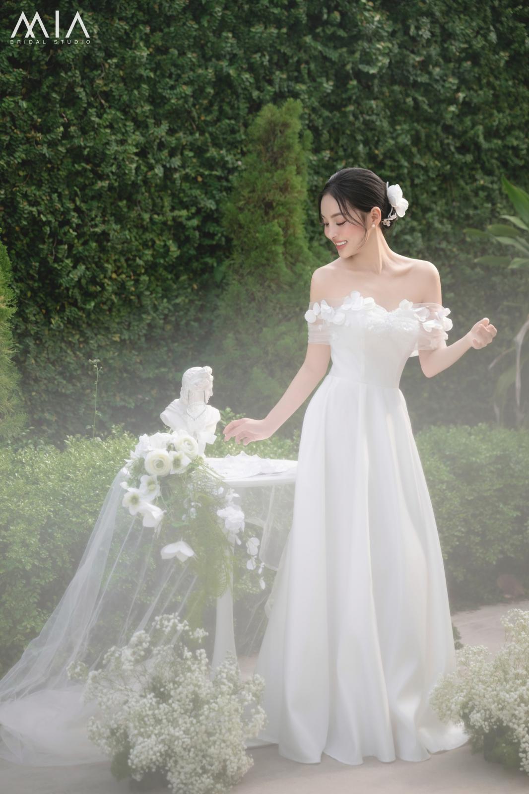 Với thiết kế trễ vai quyến rũ, họa tiết hoa 3D tinh xảo cùng chất liệu voan bồng bềnh, kết hợp cùng gam màu trắng tinh khôi giúp chiếc váy trở nên vừa thanh lịch, vừa cuốn hút cho một ngày trọng đại.