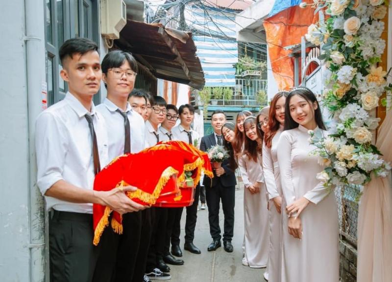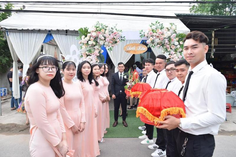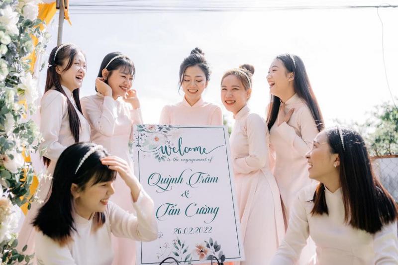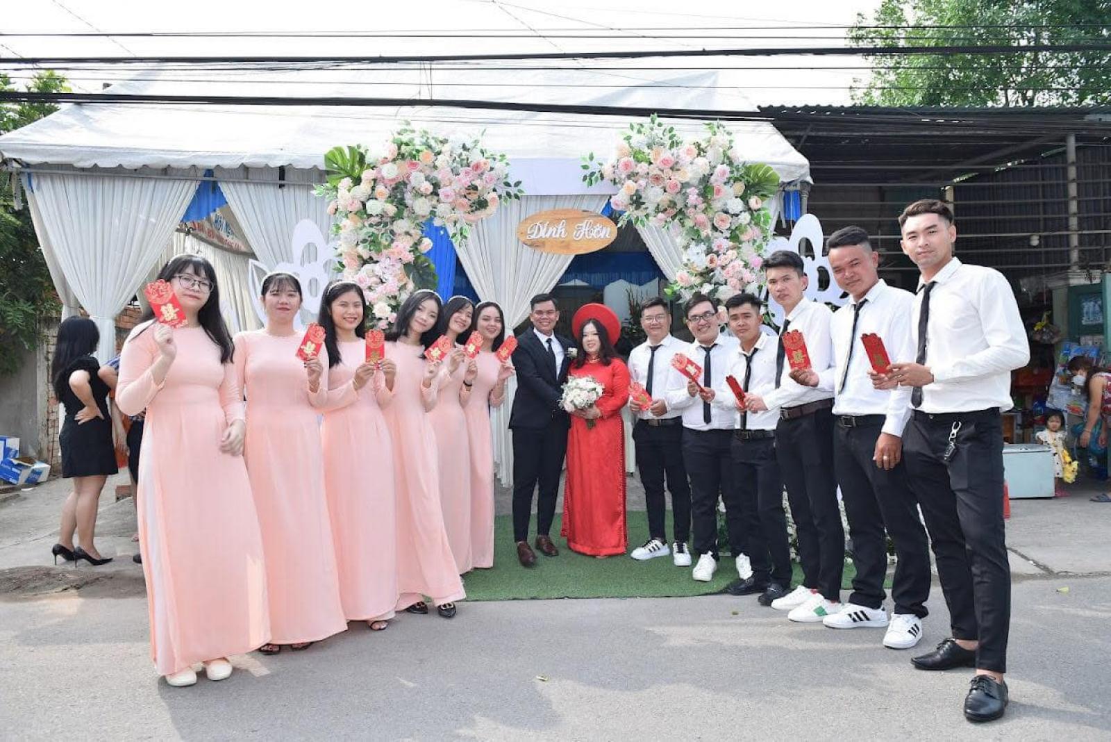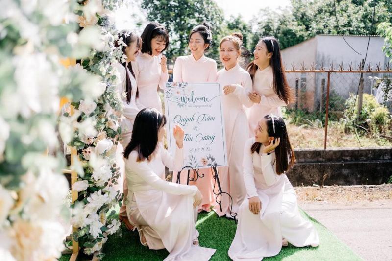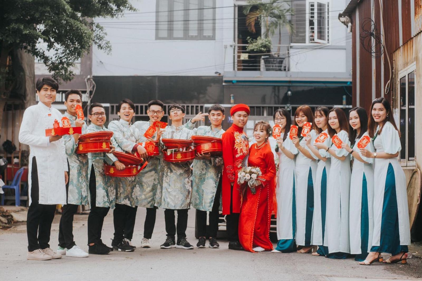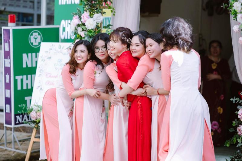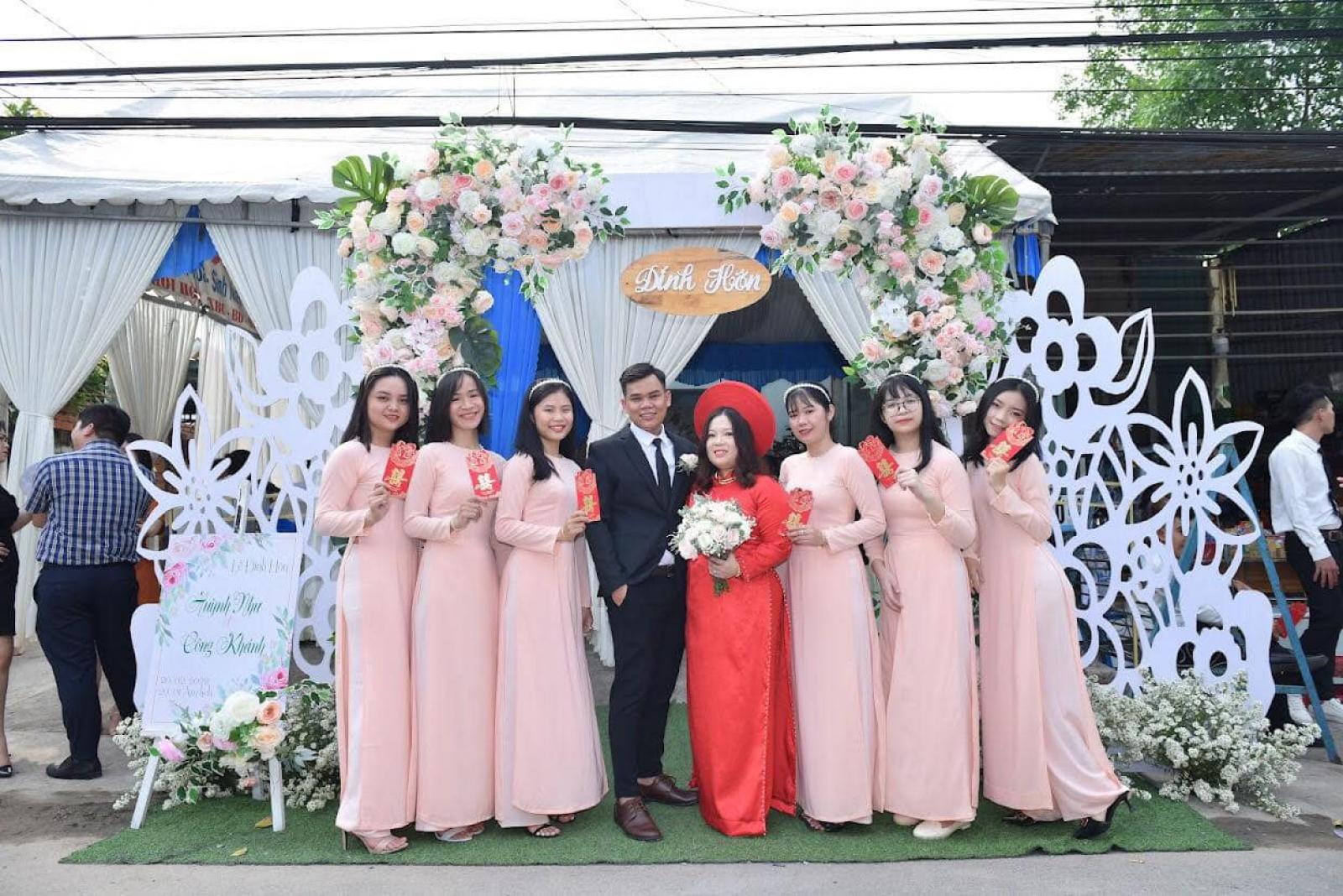 Thật vui mừng khi thấy cô dâu xinh đẹp trong chiếc áo dài lụa latinh đỏ đô cùng với dàn bưng quả rực rỡ trong áo dài lụa satin hồng nude