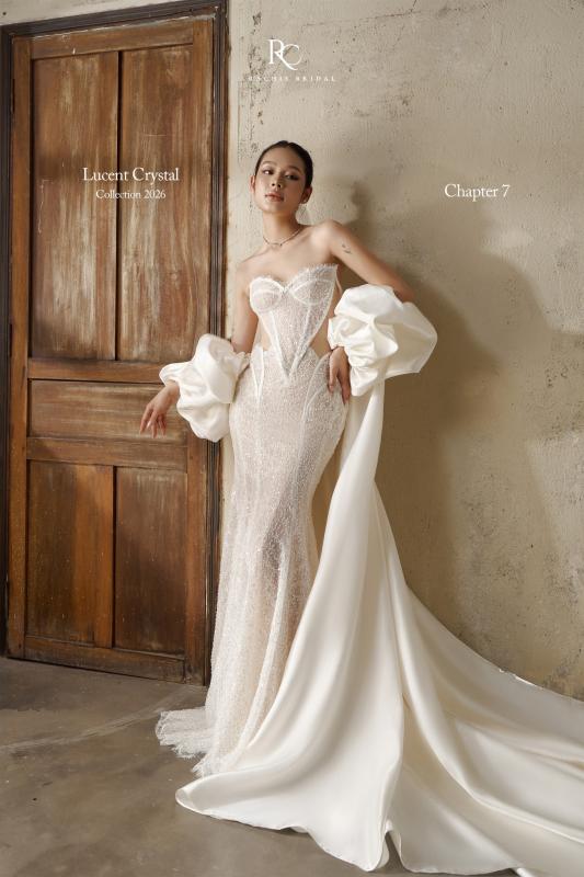 Sở hữu dáng mermaid ôm trọn đường cong, Chapter 7 gây ấn tượng với phần thân trên được xử lý tinh tế, chi tiết cut - out khéo léo kết hợp corset sắc nét, gợi nên hình ảnh nàng dâu hiện đại, nữ tính nhưng vẫn đầy cá tính.