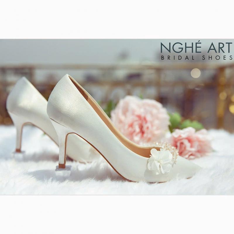 Giày cưới Nghé Art lụa satin đính hoa pha lê 339 trắng.