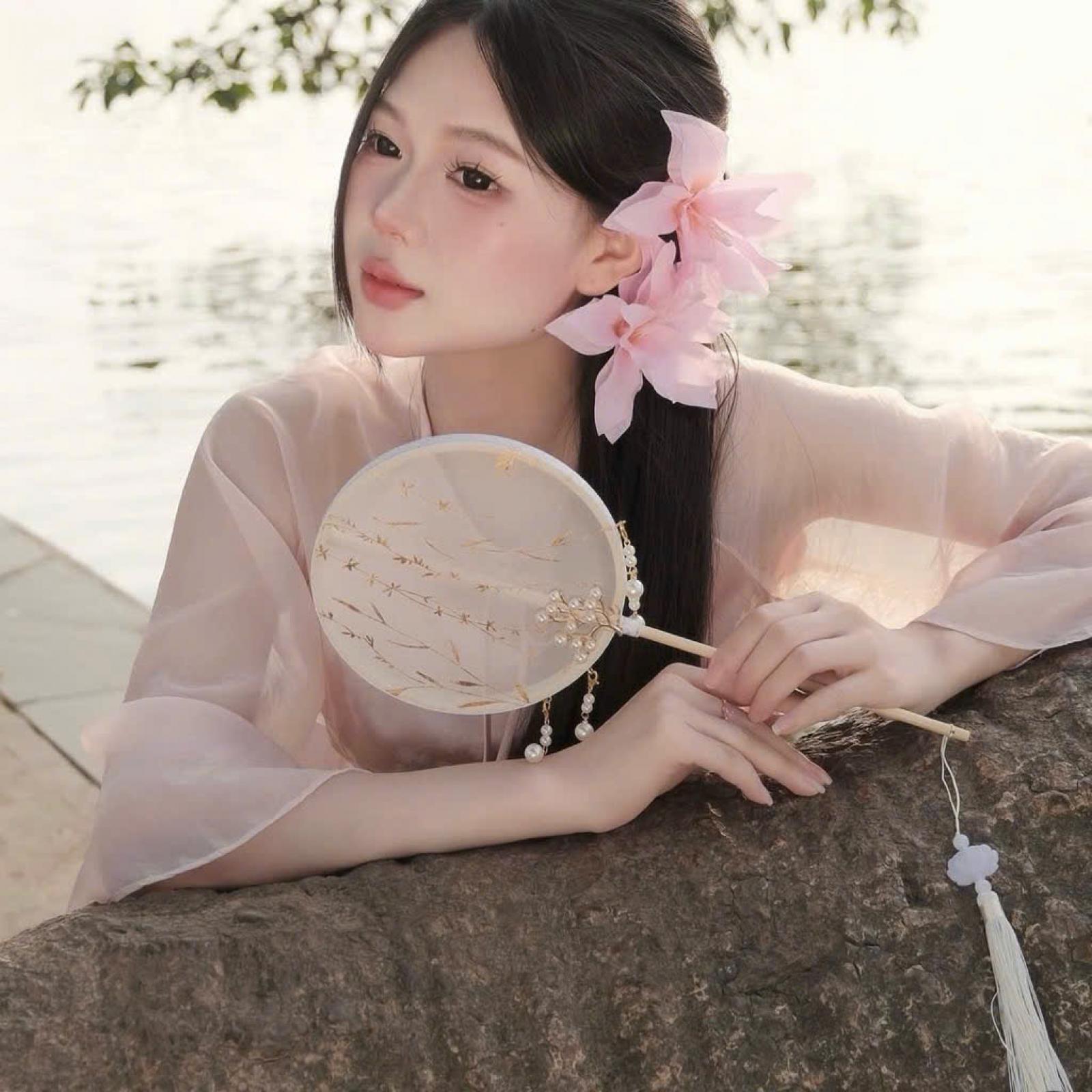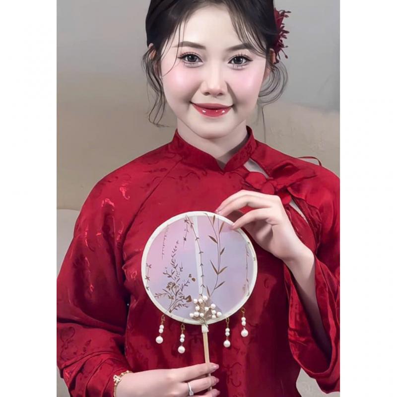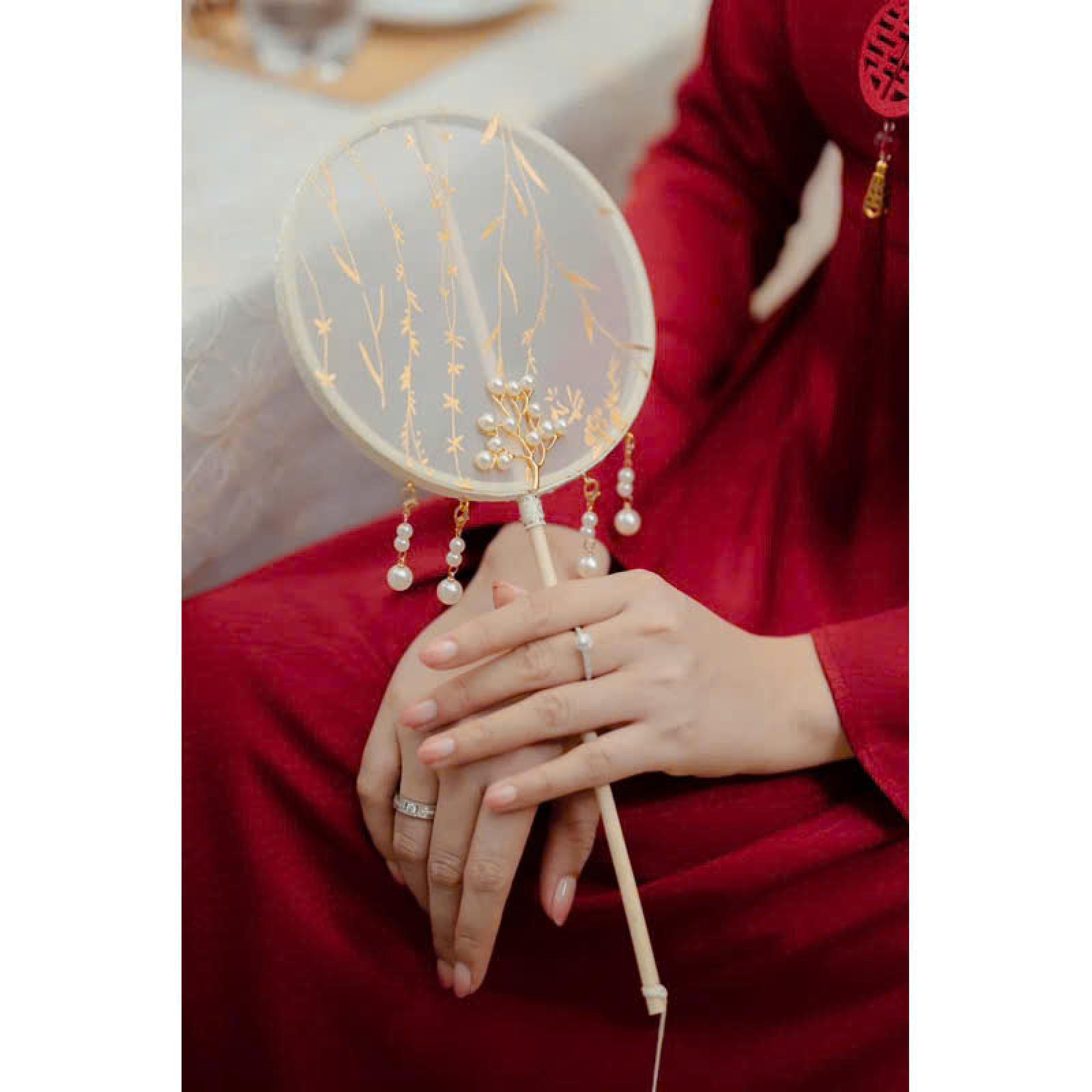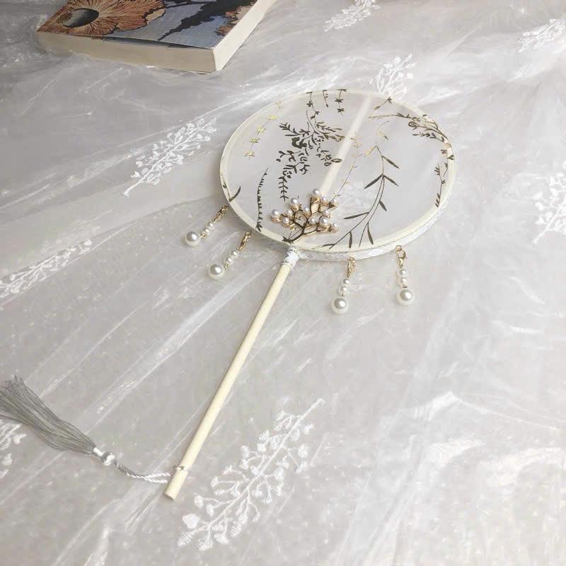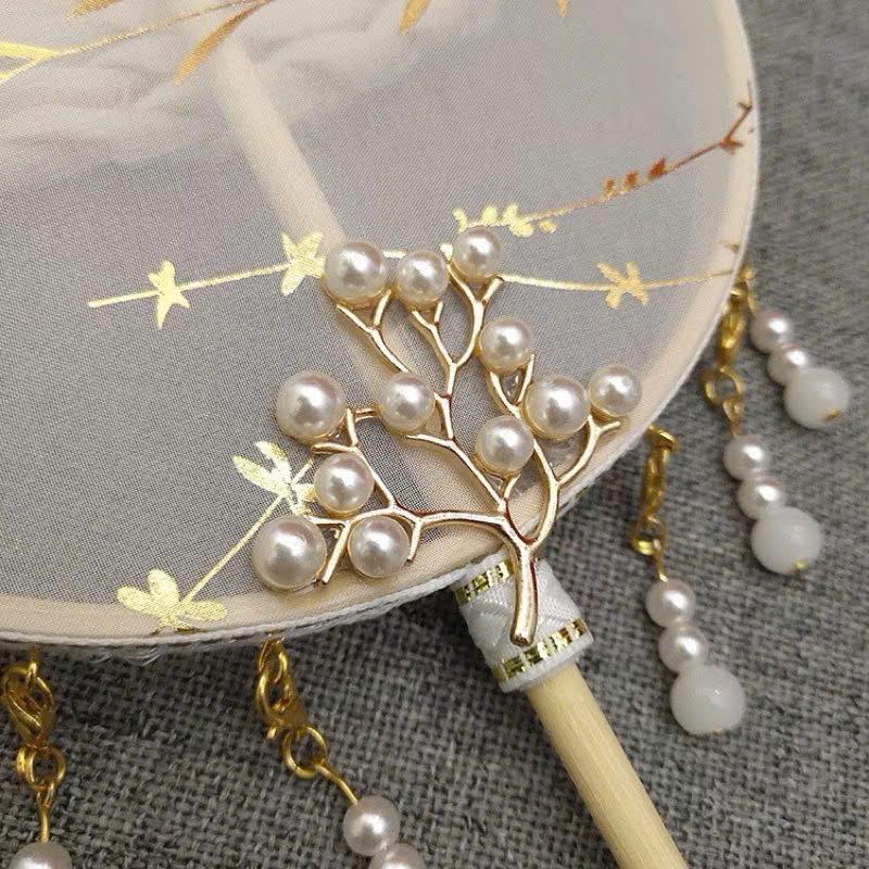 Quạt tròn cầm tay cô dâu trắng hoa phối tua rua.
