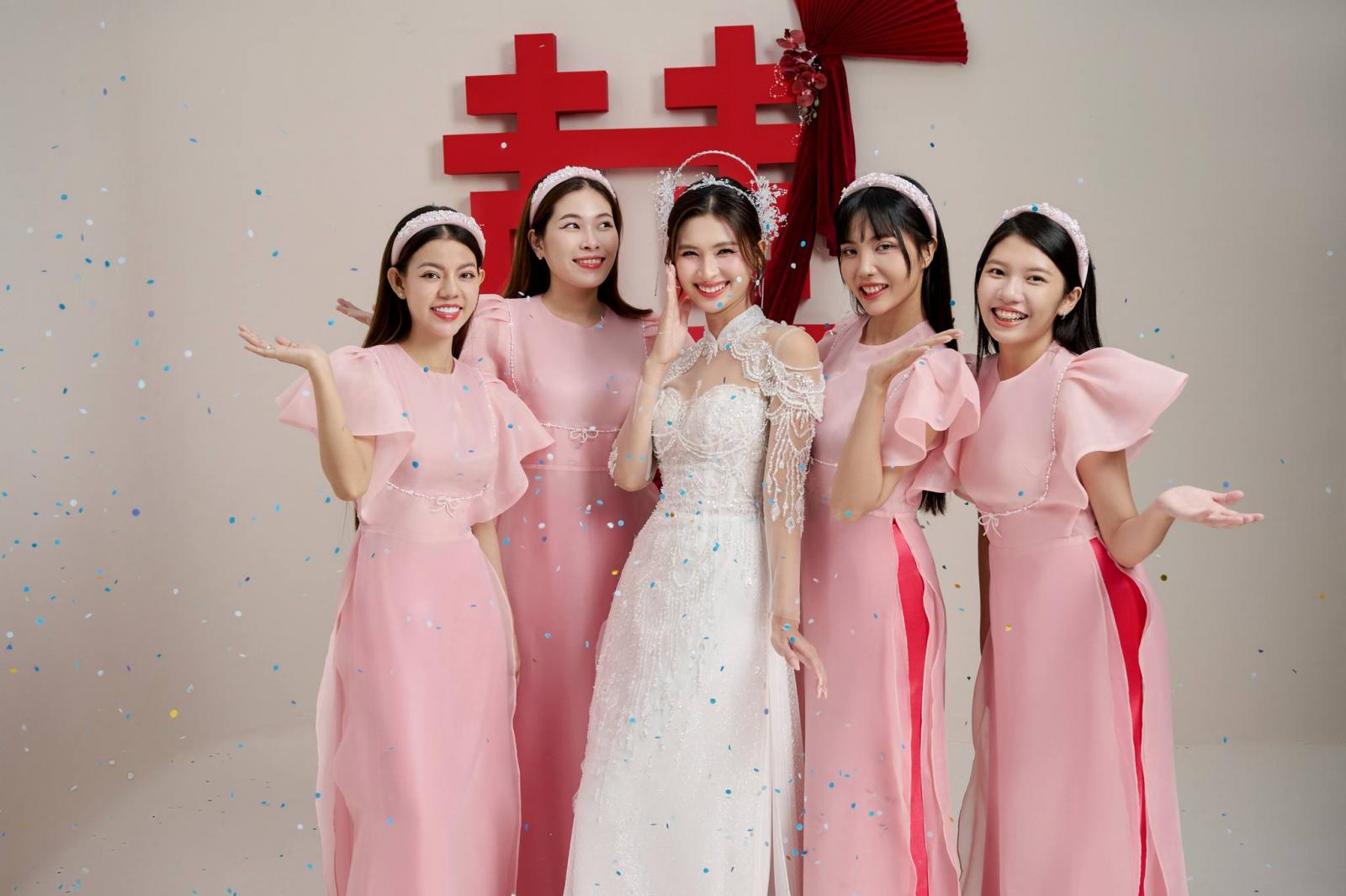 The design brings the bride a soft, graceful beauty, finished with delicate embroidery details woven along the traditional red áo dài.