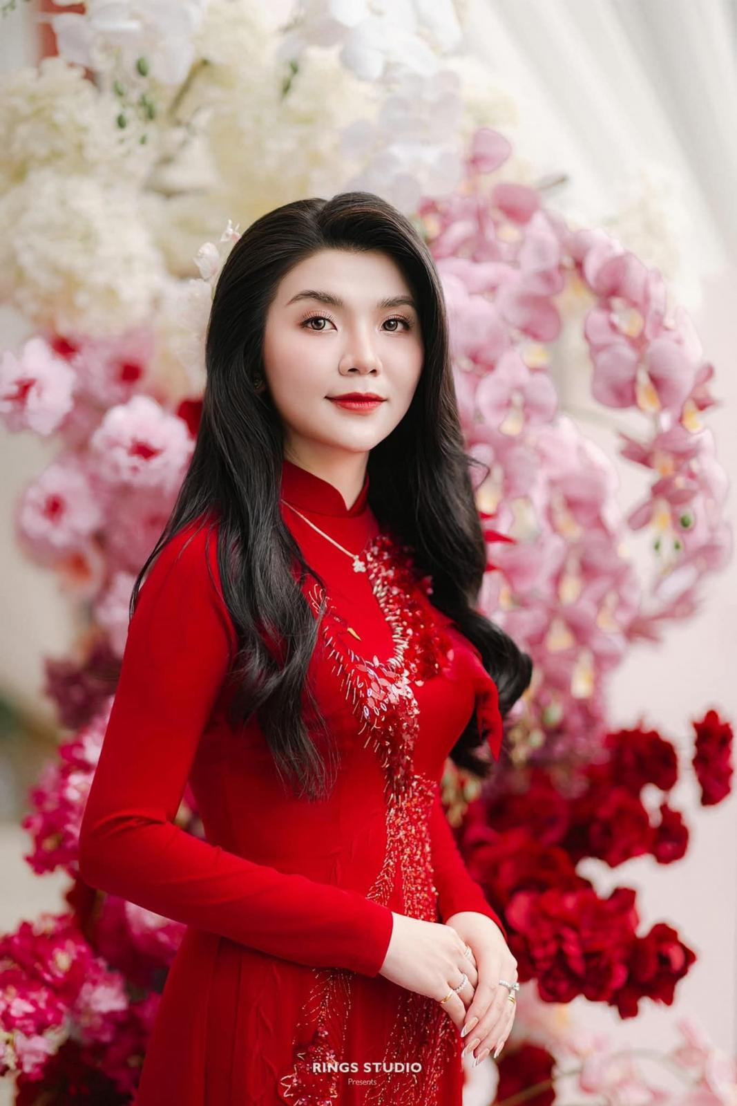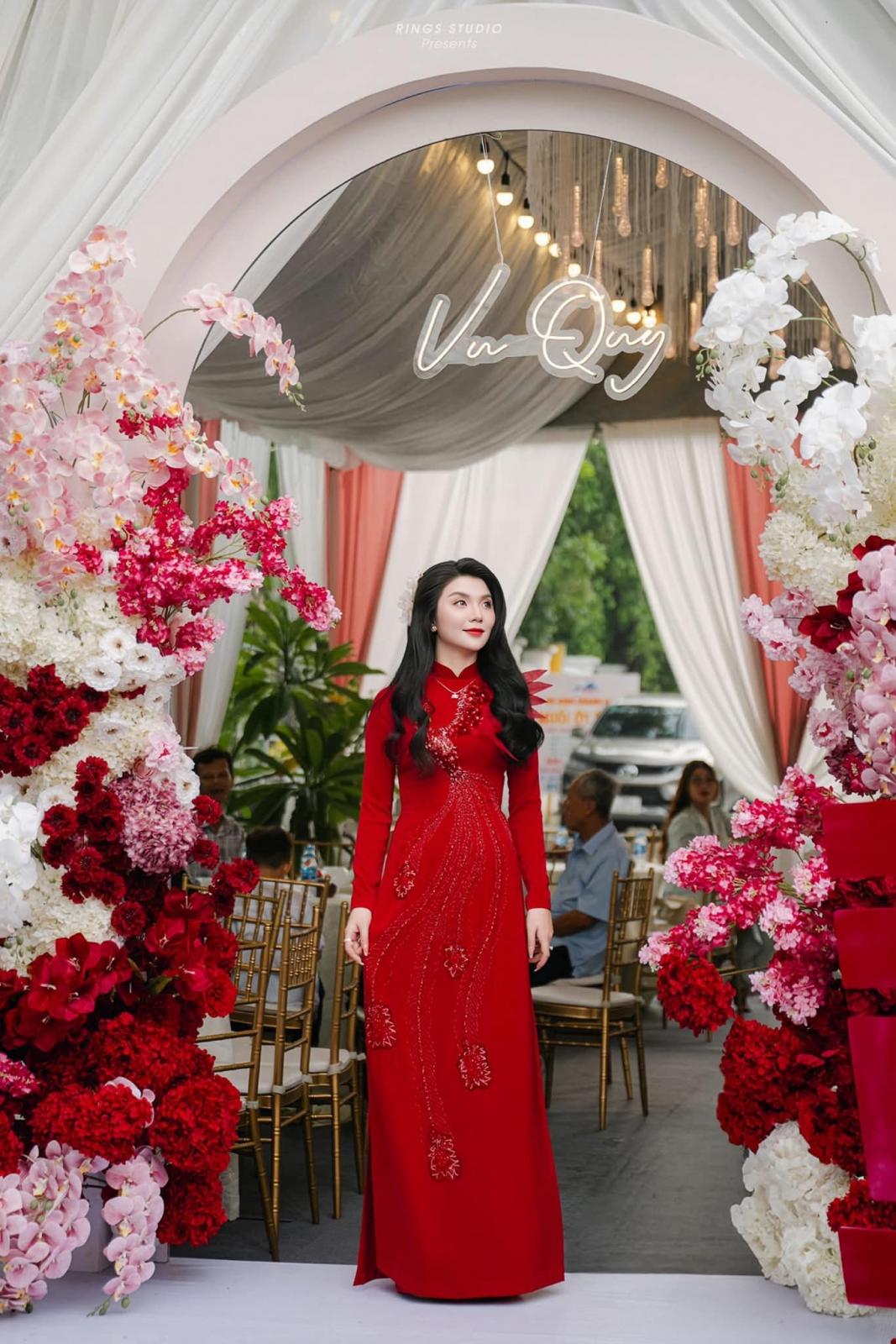 Khoác lên mình sắc đỏ rực rỡ, mỗi bước đi trong tà áo dài Châu Thuần tựa cánh hoa lay động trong gió, tôn lên nét duyên dáng thanh thoát và thần thái rạng ngời của nàng trong khoảnh khắc thiêng liêng của cuộc đời.