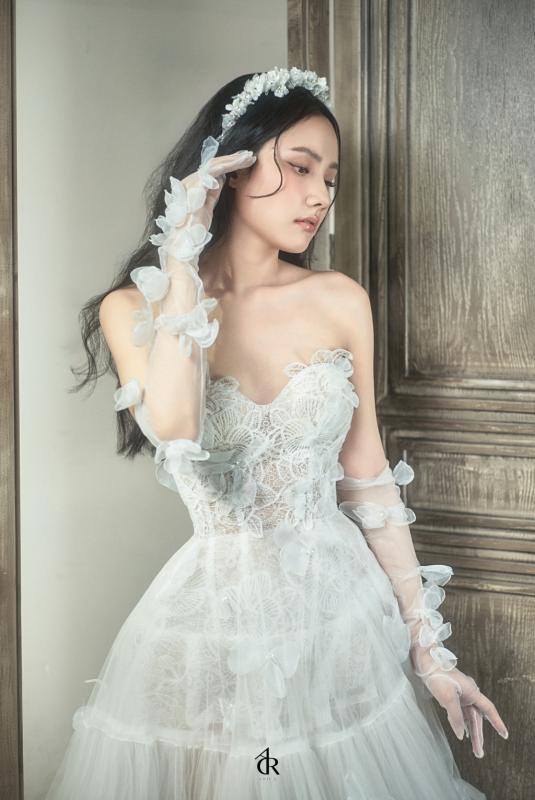 Thân áo dáng corset cổ điển, ôm trọn đường cong nàng cùng dáng váy bồng bềnh vừa đủ để nàng thoải mái di chuyển mà vẫn tôn lên vẻ đẹp kiêu sa, tựa như nàng công chúa đang nhảy múa giữa vườn thu.
