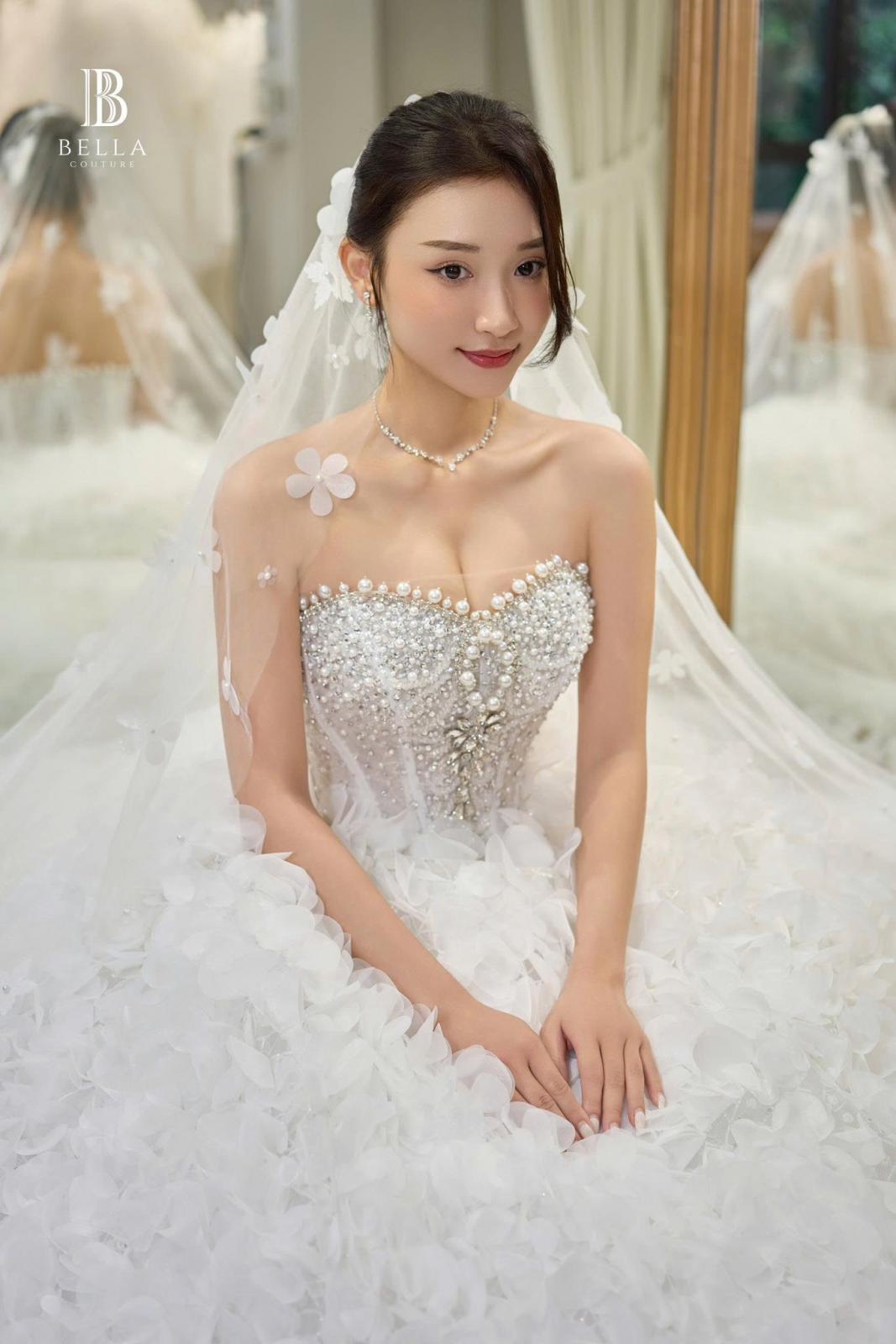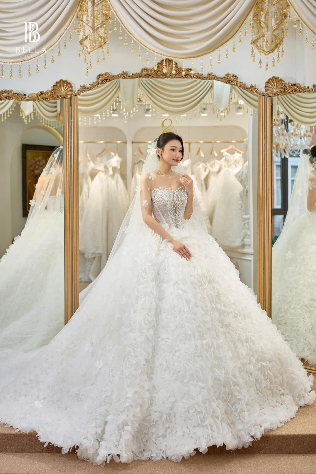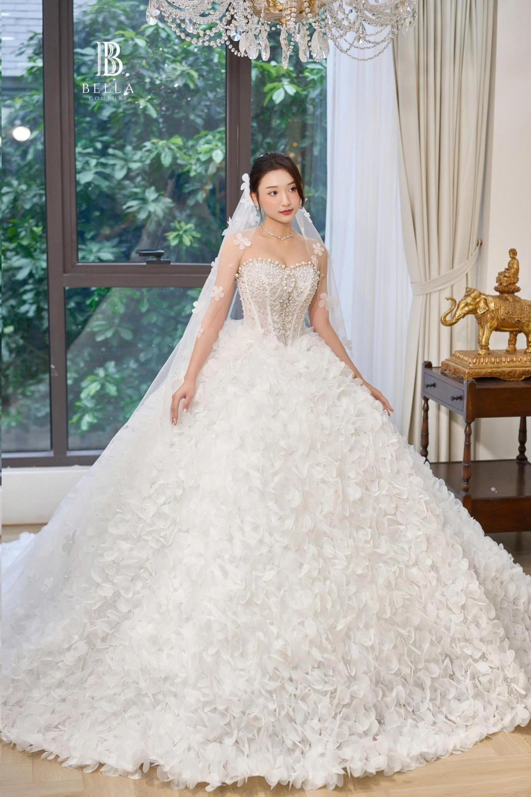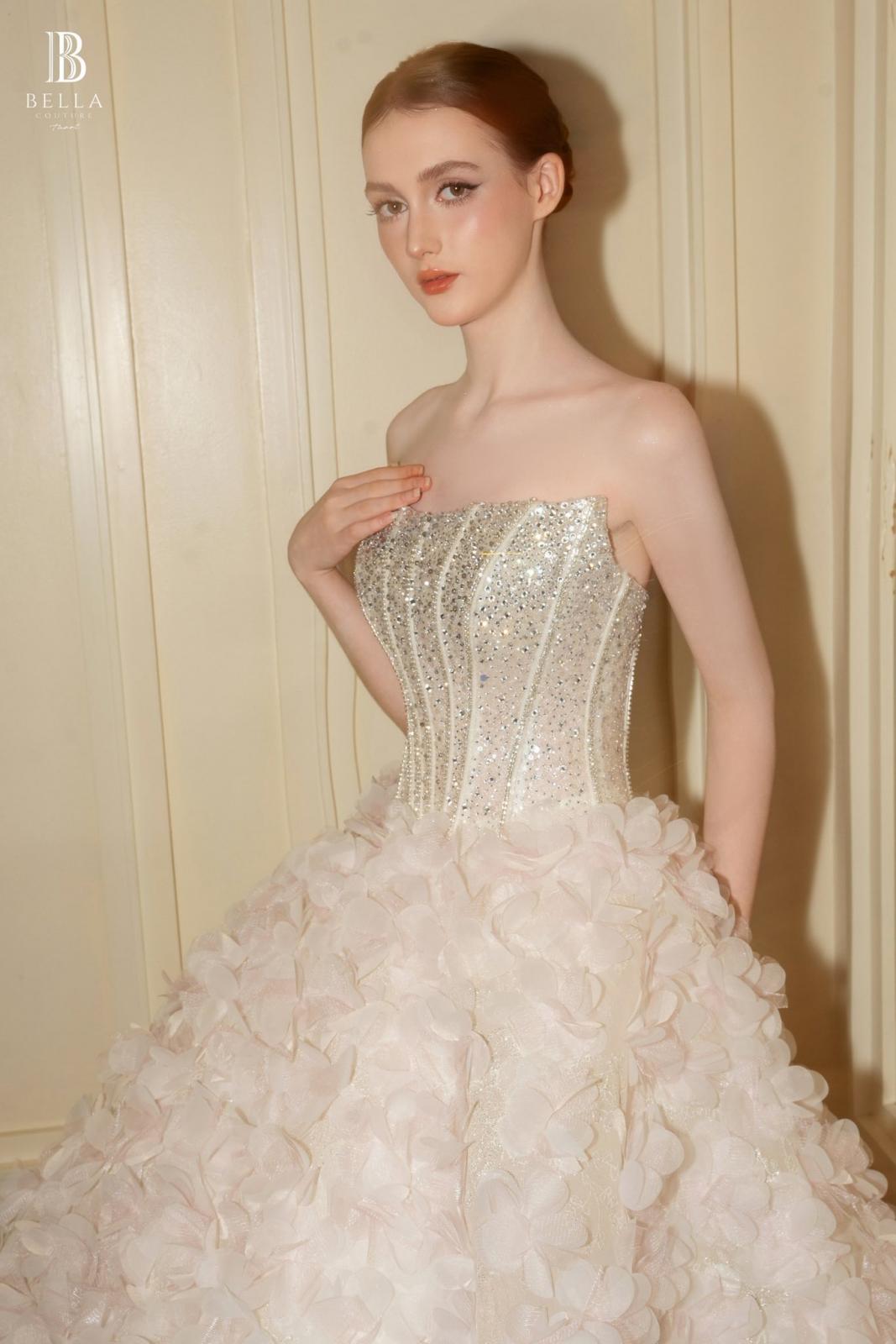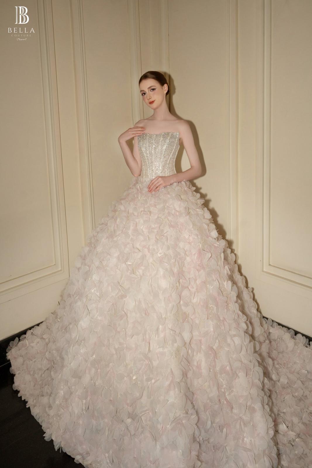 🥰 Form dáng ball gown cổ điển với phần corset ôm trọn đường cong, giúp nàng trở thành tâm điểm lộng lẫy như một nàng công chúa trong truyện cổ. Hàng ngàn cánh hoa 3D kết đính tỉ mỉ cùng hạt pha lê lấp lánh, tạo nên hiệu ứng lấp lánh, nơi từng bước đi là một vũ điệu của ánh sáng và hoa.