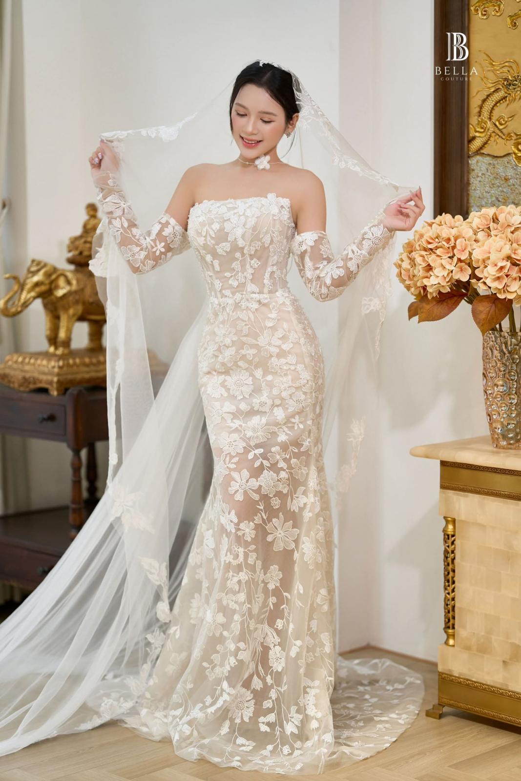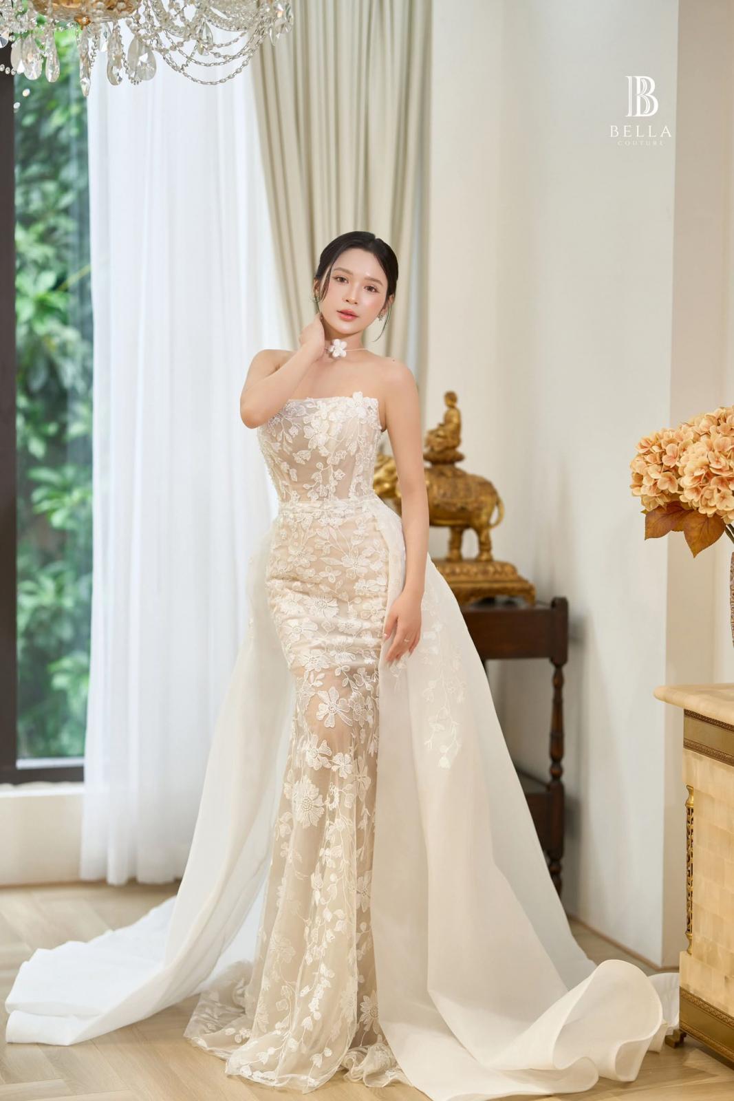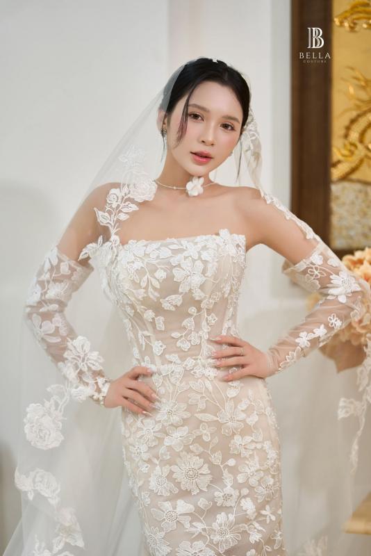 hông cần bồng xoè hay đính đá cầu kỳ, chiếc váy cưới mà Bella dành riêng cho cô dâu Hà Trang vẫn đủ sức khiến mọi ánh mắt phải say đắm. Lớp ren hoa cao cấp phủ toàn thân váy, thiết kế tôn lên đường nét yêu kiều của nàng dâu theo cách rất riêng tinh tế, gợi cảm.