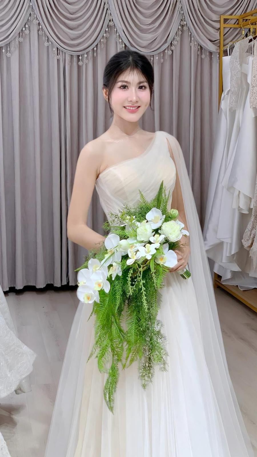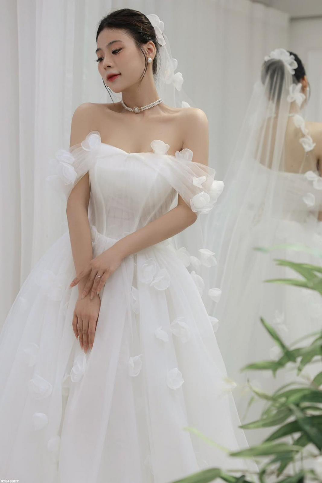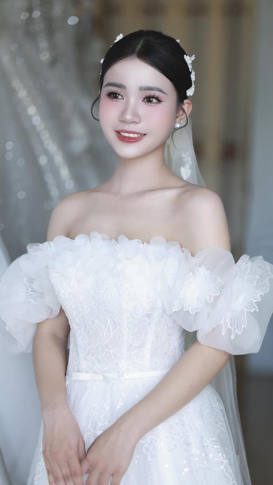 Chiếc váy cưới trắng muốt ôm lấy vóc dáng mảnh mai, được tô điểm bởi những đường ren tinh tế, lấp lánh ánh pha lê bạc mềm mại, biến nàng dâu trở thành tâm điểm rực rỡ nhất trong ngày trọng đại.