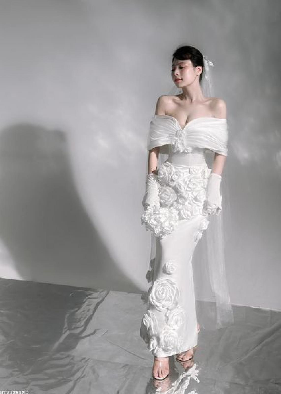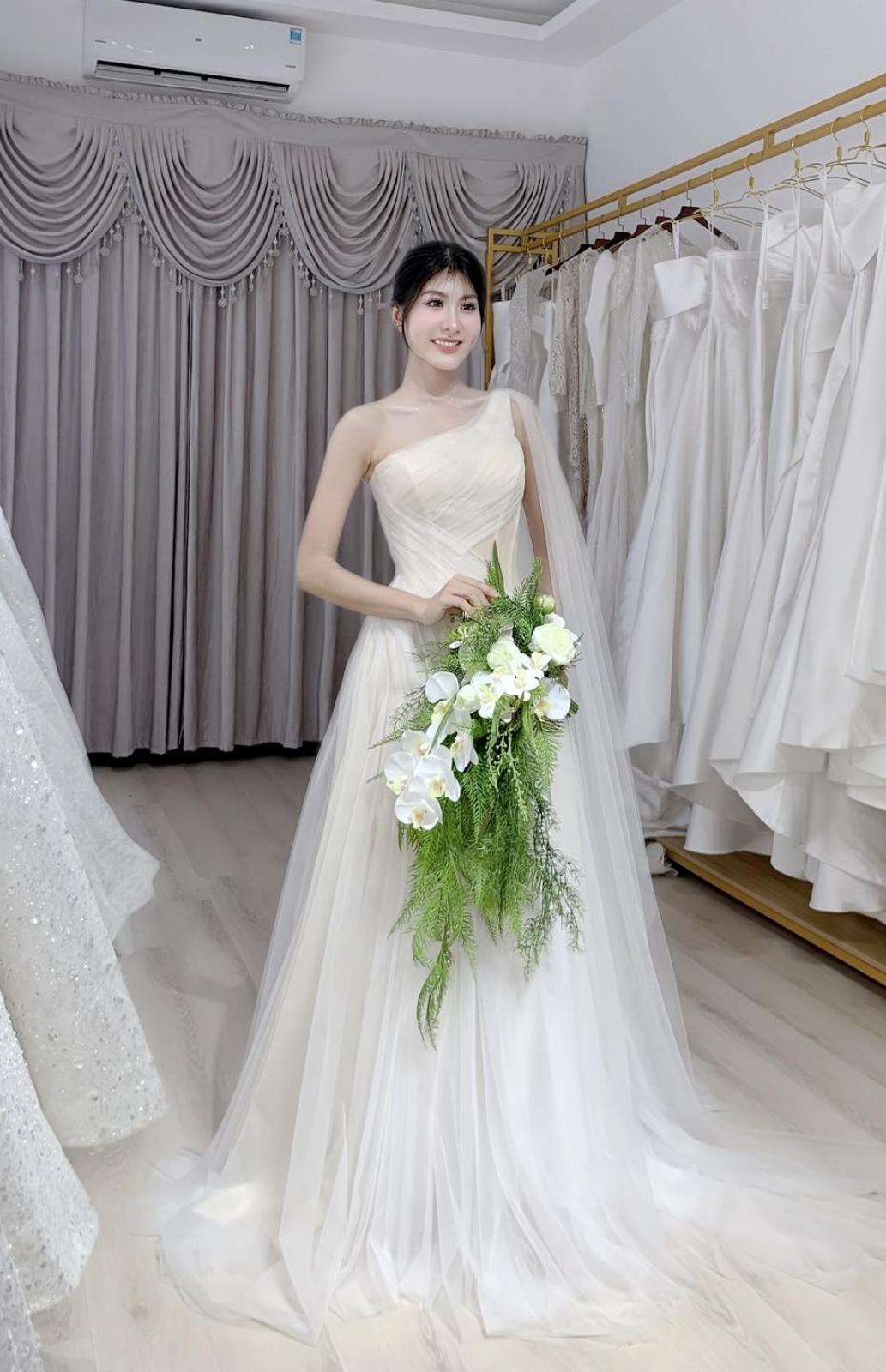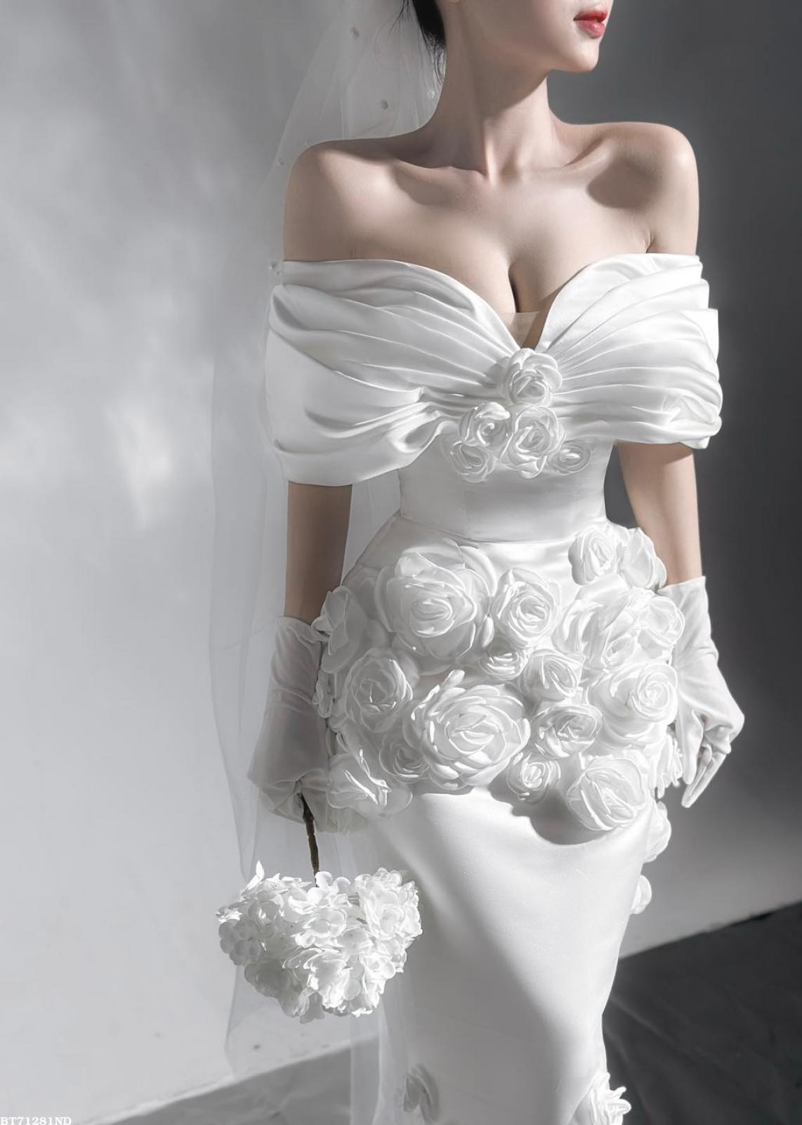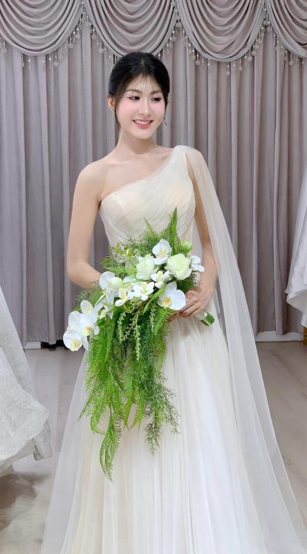 Chiếc váy cưới trắng muốt ôm lấy vóc dáng mảnh mai, được tô điểm bởi những đường ren tinh tế, lấp lánh ánh pha lê bạc mềm mại, biến nàng dâu trở thành tâm điểm rực rỡ nhất trong ngày trọng đại.