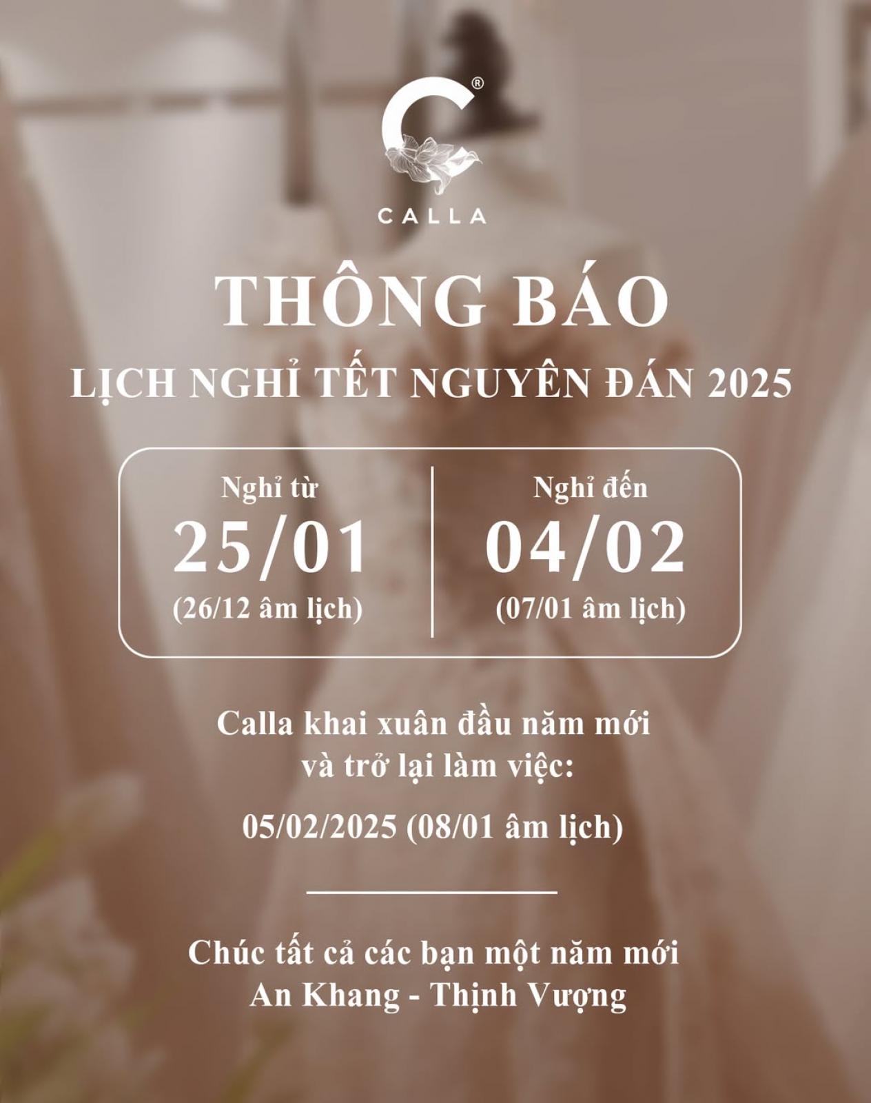 Calla Bridal xin trân trọng thông báo lịch nghỉ Tết Xuân Ất Tỵ 2025 như sau: