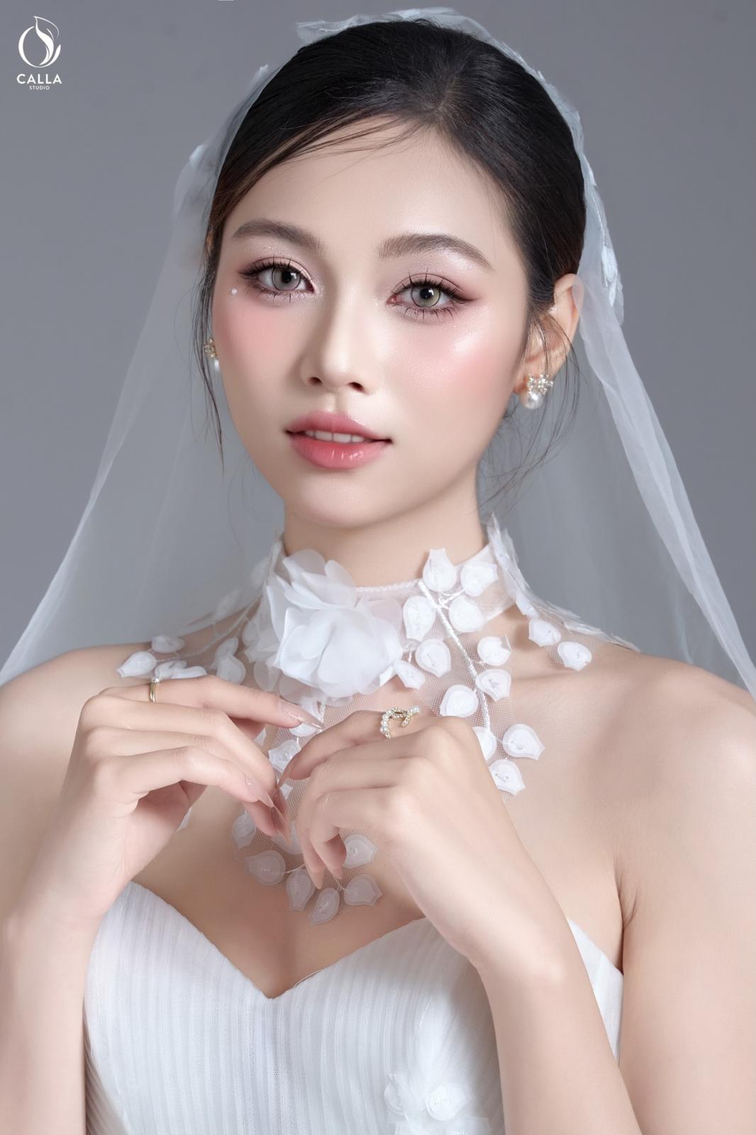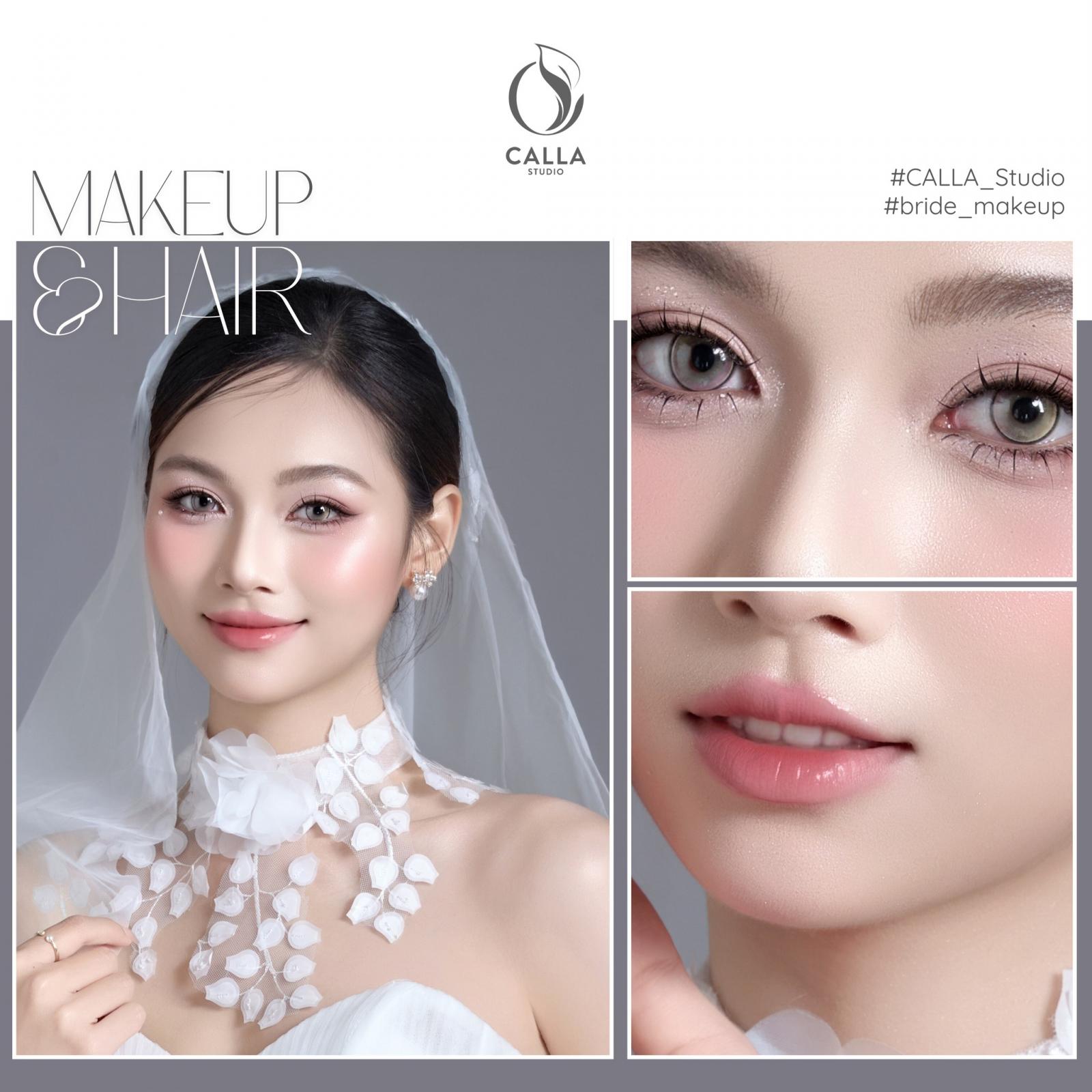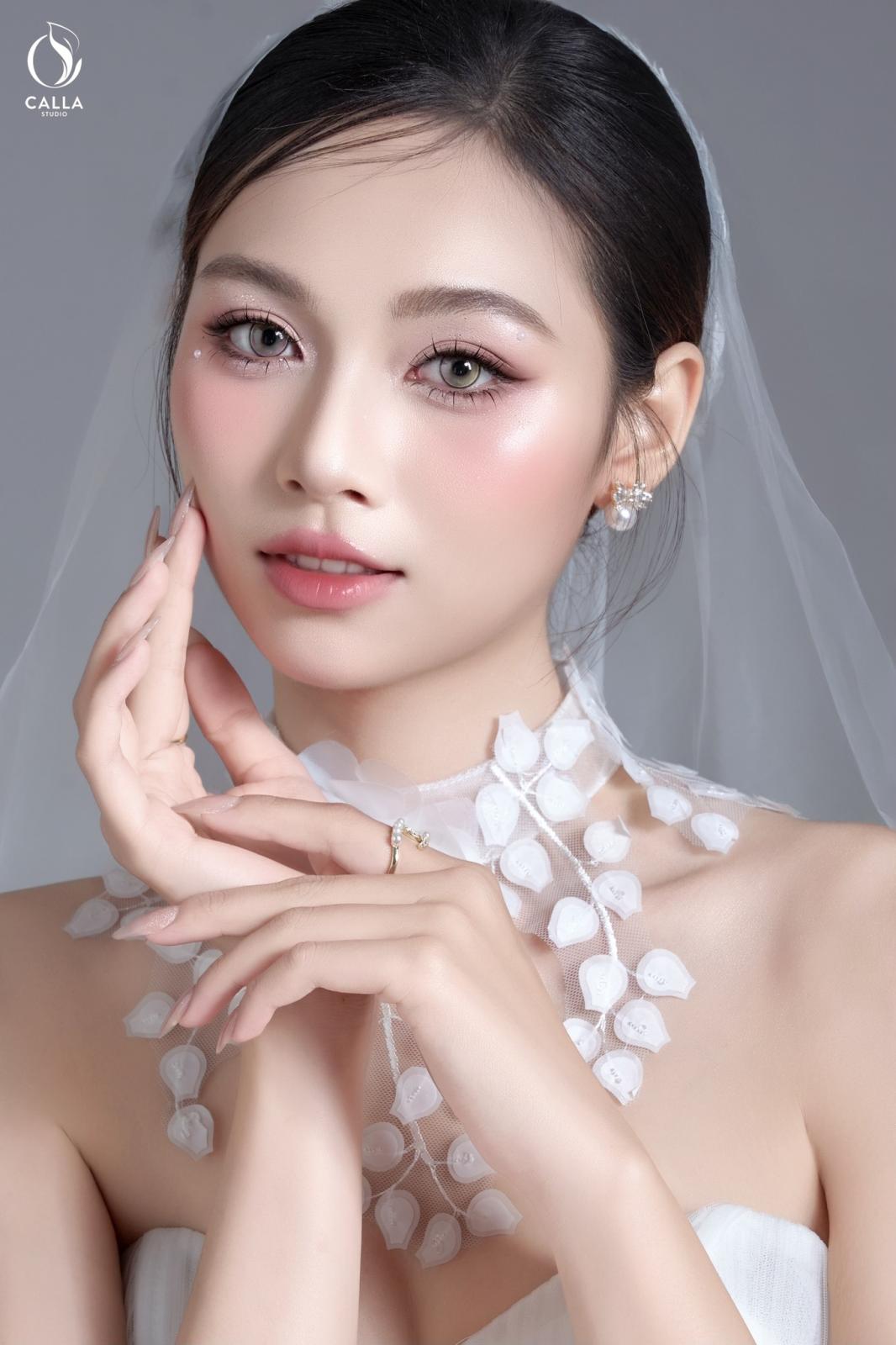 Lớp nền mỏng mịn căng bóng điểm highlight tinh tế.�Gò má ửng hồng nhẹ, đôi môi mềm mại tự nhiên.�Tất cả cùng hòa quyện để tôn lên vẻ đẹp thuần khiết, trẻ trung và tinh tế của các nàng dâu tại CALLA Studio.