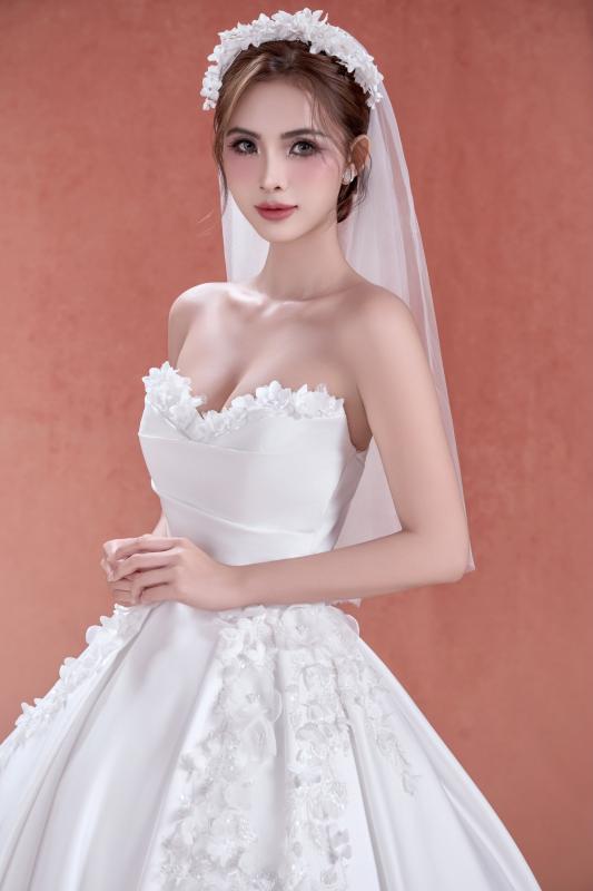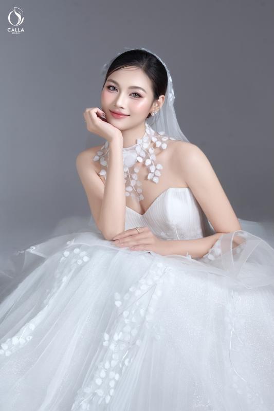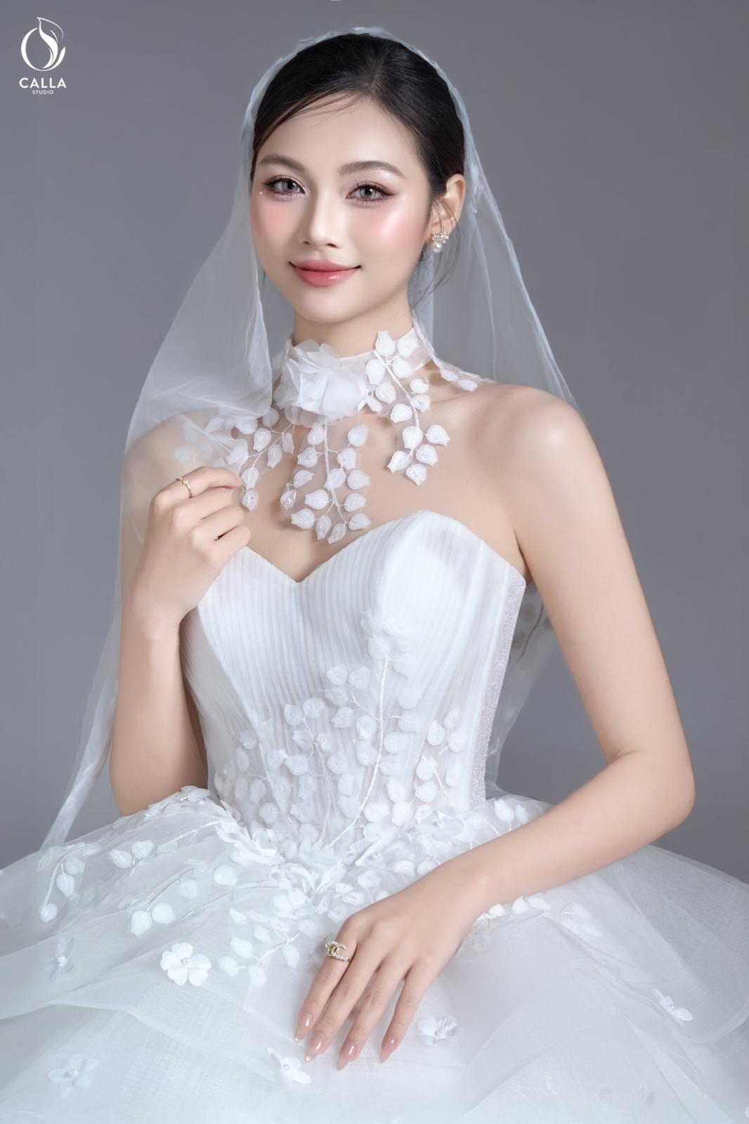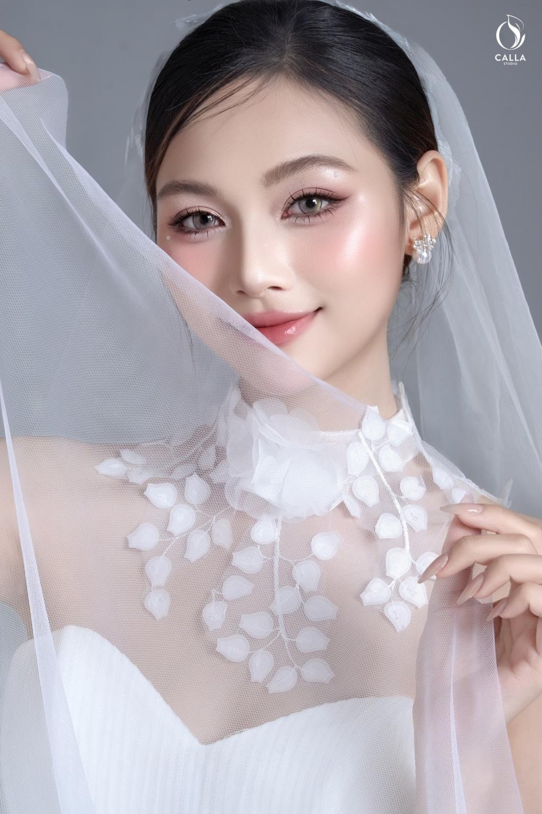 Lớp nền mỏng mịn căng bóng điểm highlight tinh tế.�Gò má ửng hồng nhẹ, đôi môi mềm mại tự nhiên.�Tất cả cùng hòa quyện để tôn lên vẻ đẹp thuần khiết, trẻ trung và tinh tế của các nàng dâu tại CALLA Studio.