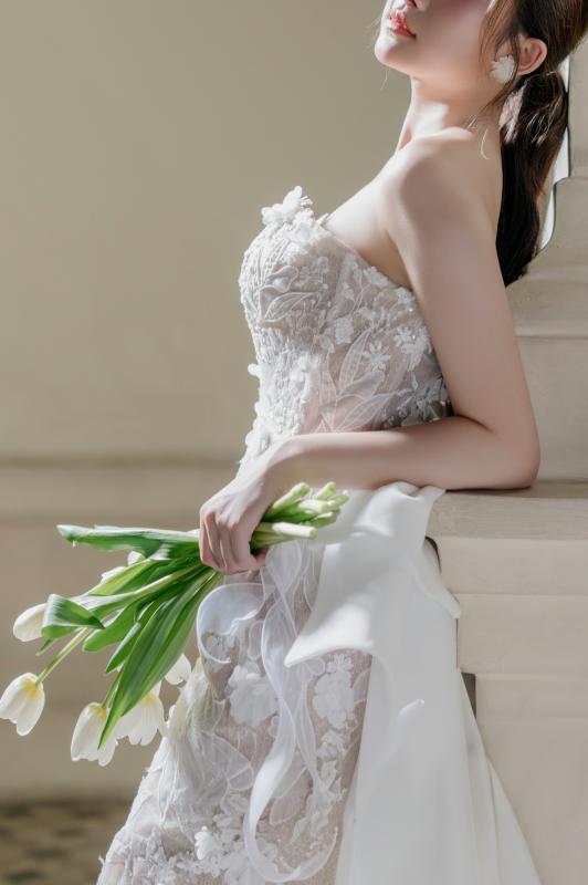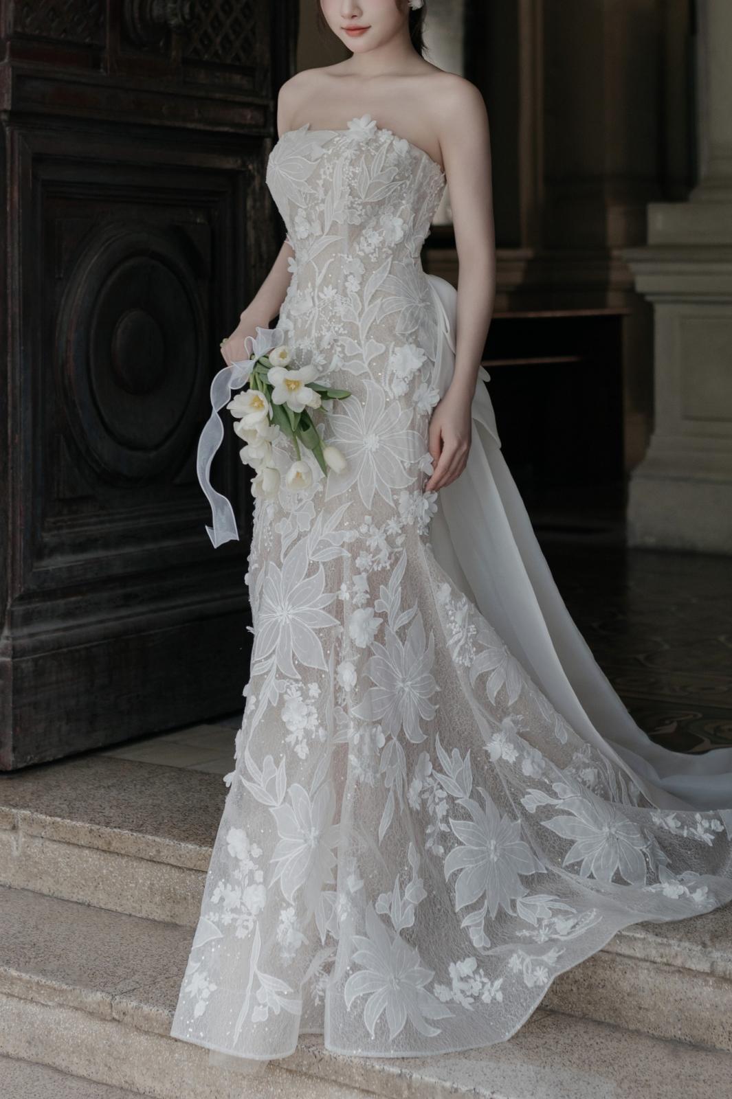 Một chiếc váy cưới mang dáng dấp tinh tế, với chất liệu ren xuyên thấu được phủ hoa nổi 3D mềm mại, ôm trọn đường cong và tạo cảm giác vừa gợi cảm vừa thanh tao. Gợi nên sự lãng mạn và thanh khiết như một bông hoa đang nở rộ trong ngày hạnh phúc...