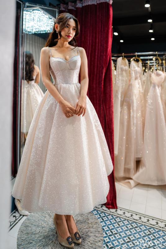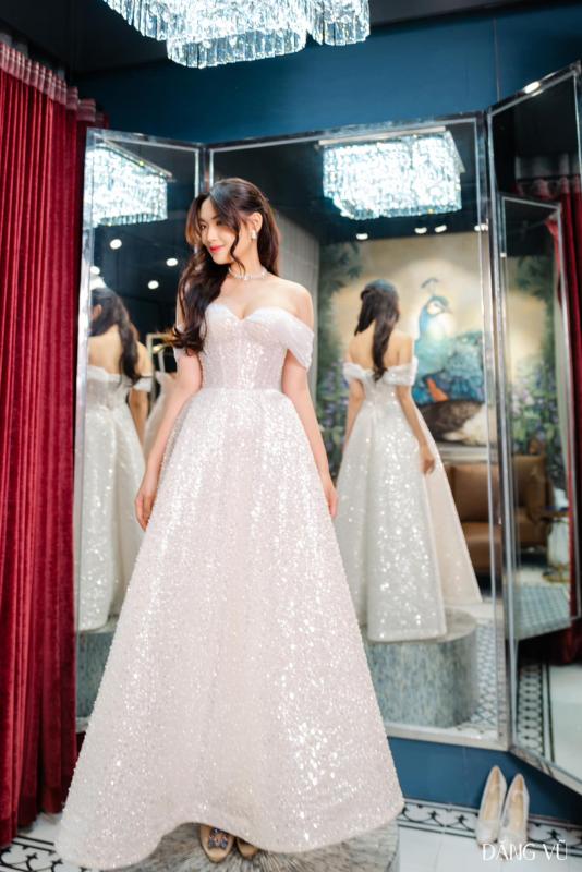 Váy cưới trễ vai kết hợp chi tiết tay áo rời tạo ra vẻ ngoài ngọt ngào và quyến rũ. Với độ dài vừa đủ dễ dàng di chuyển, cùng kỹ thuật corset ẩn hiện, màu sắc peony pink nhẹ nhàng xen kẽ những hạt ngọc trai óng ánh. Đây là một lựa chọn tuyệt vời cho tiệc cưới champange của cô dâu Mai Anh.