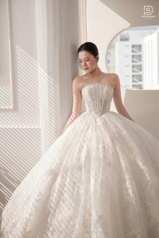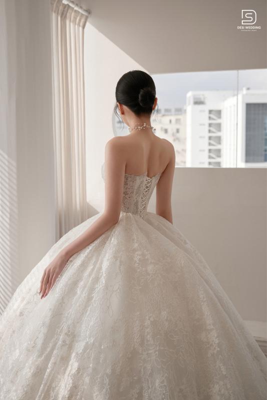 Thiết kế cúp ngực tinh xảo kết hợp với form dáng ballgown cùng họa tiết ren hoa nổi mềm mại, tạo nên một tổng thể hài hòa giữa nét kiêu sa và nhẹ nhàng. Từng đường cong được tôn vinh trọn vẹn, giúp nàng toát lên vẻ đẹp tinh tế đầy cuốn hút.