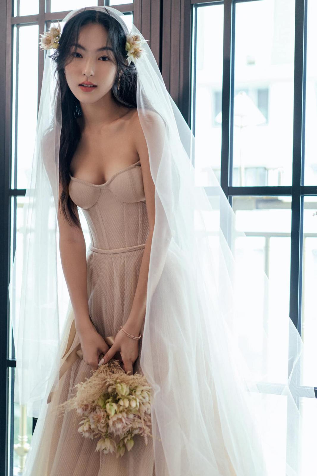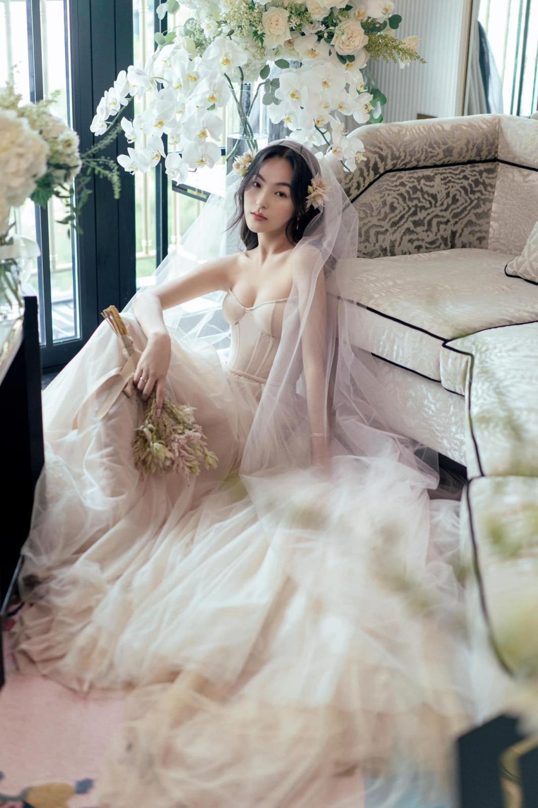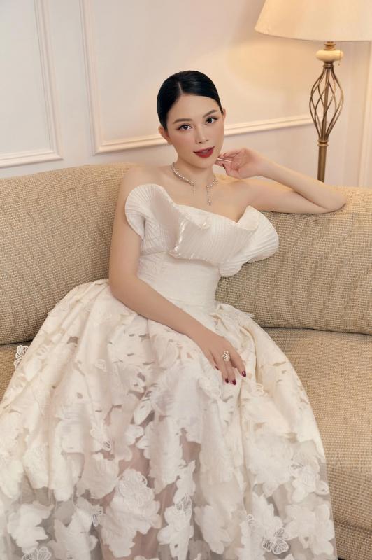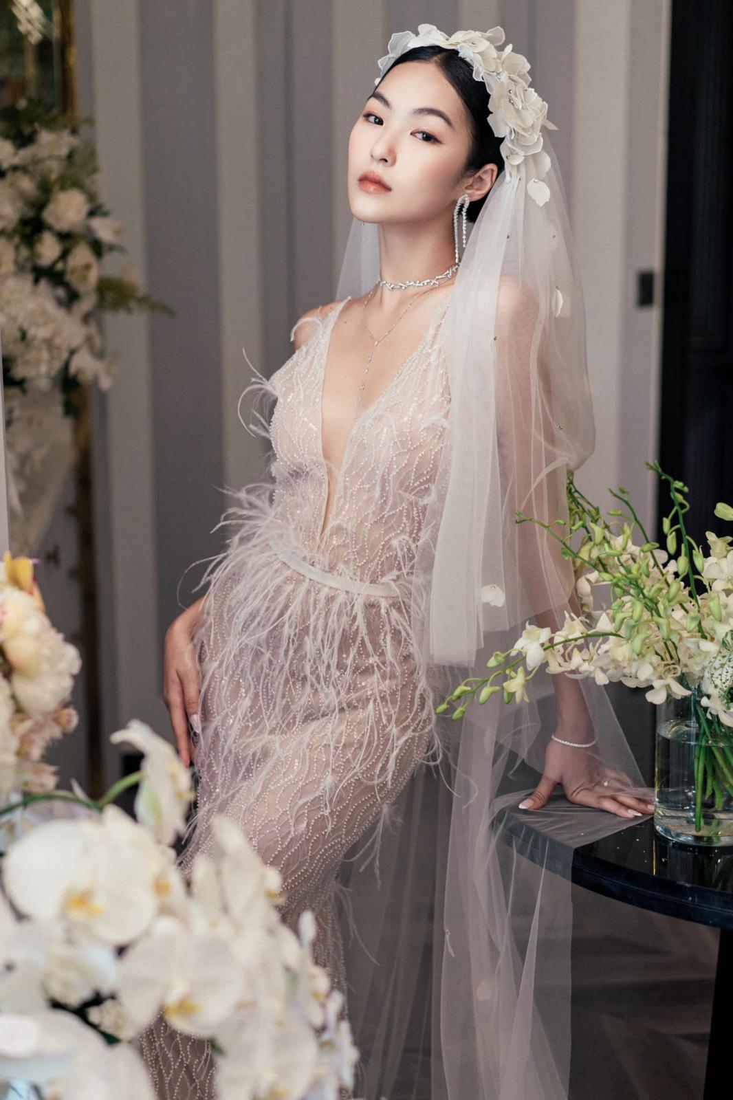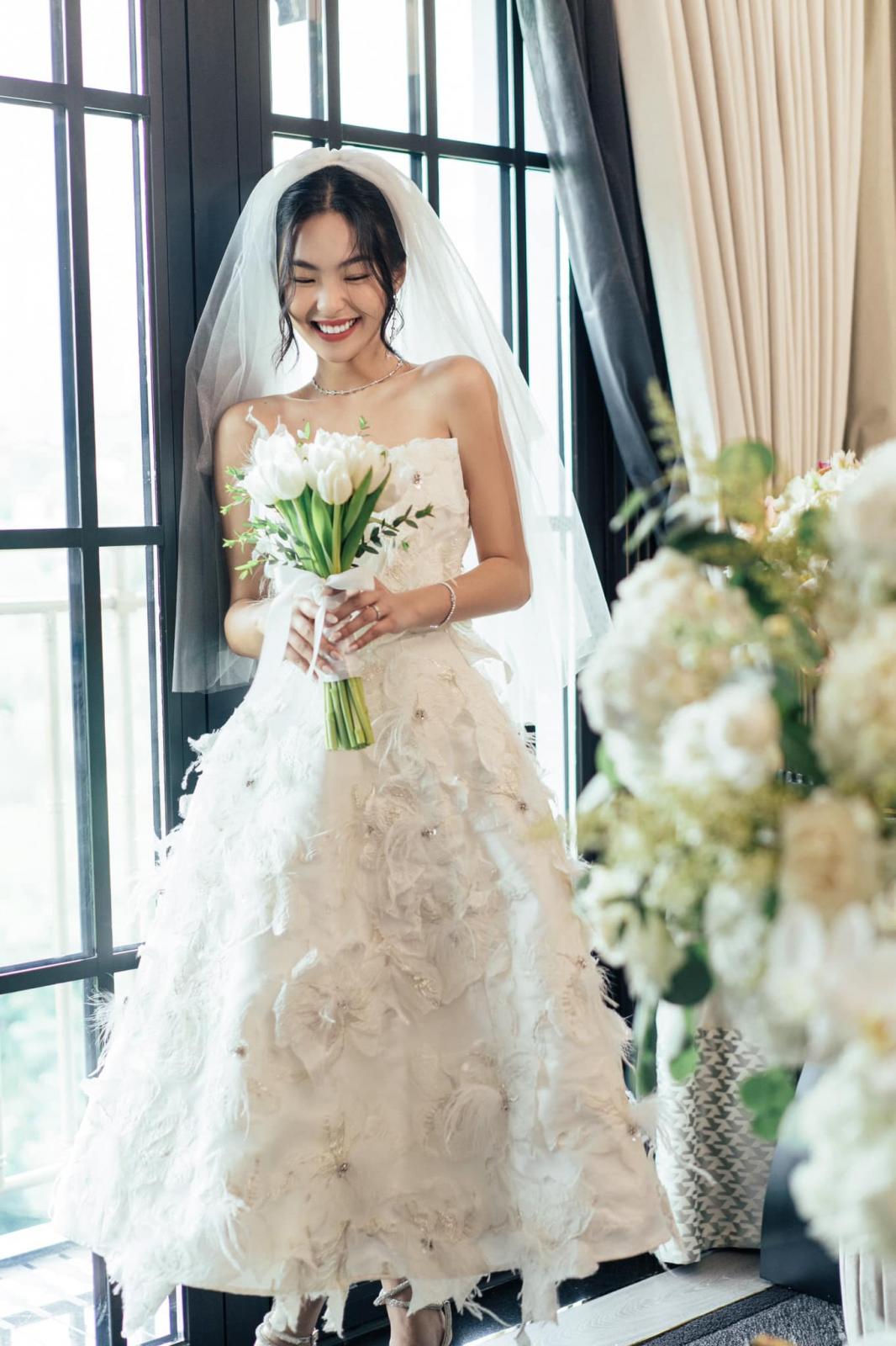 Thấu hiểu gout thẩm mỹ cùng tư duy thời trang hiện đại của cô dâu, trang phục cưới được định hướng không đính kết cồng kềnh kim sa hay váy tầng phức tạp như những lựa chọn trang phục cưới thông thường, mà thay vào đó cấu trúc và phom dáng được tiết chế hài hoà, tinh tế để tập trung vào việc xử lý chất liệu điêu luyện cũng như chi tiết tạo hình thủ công độc đáo trên bề mặt vải.