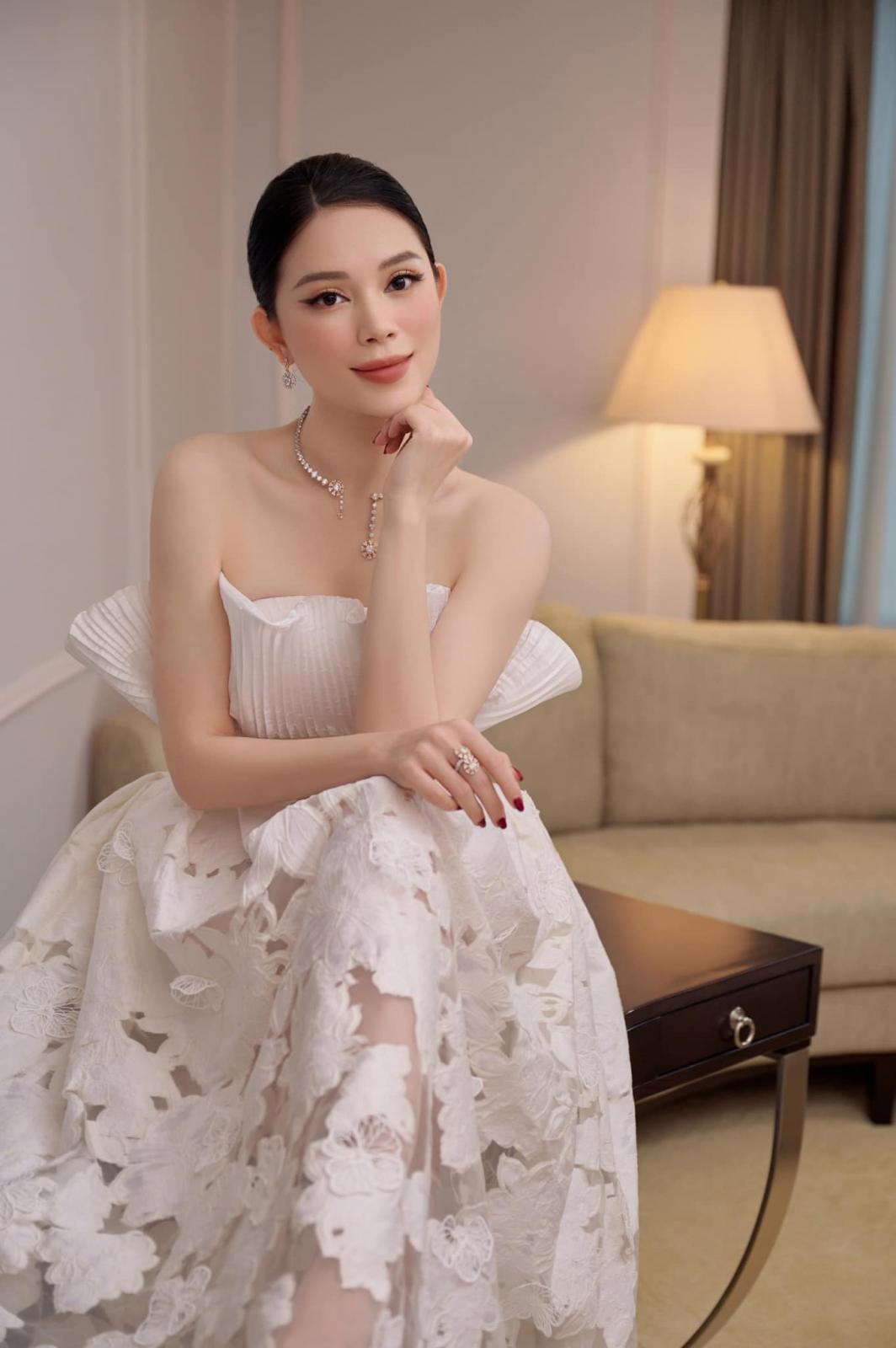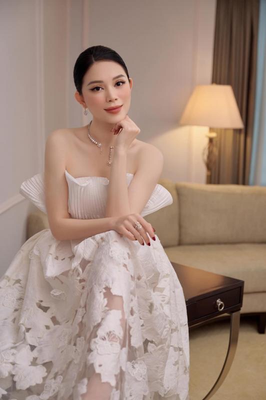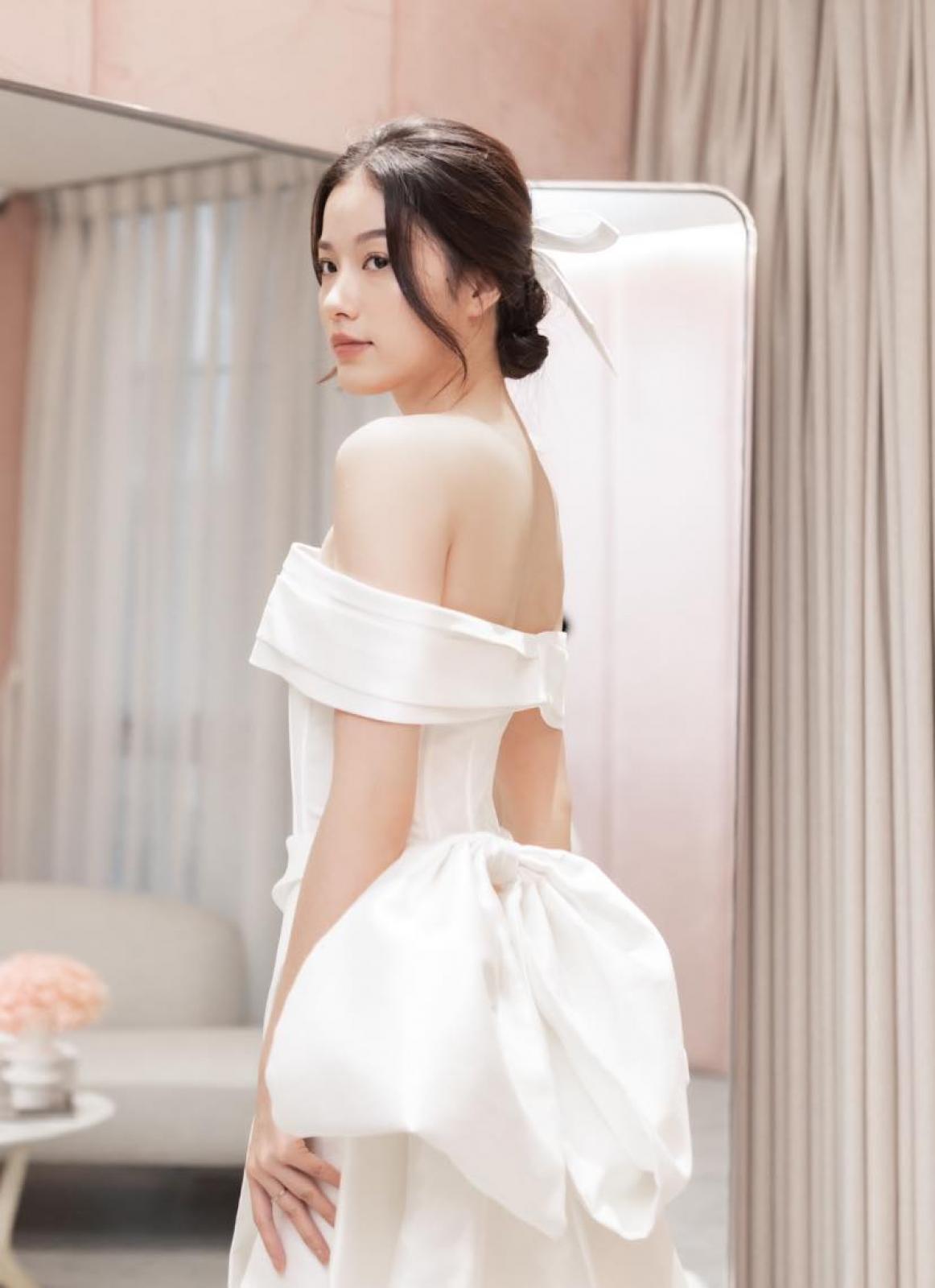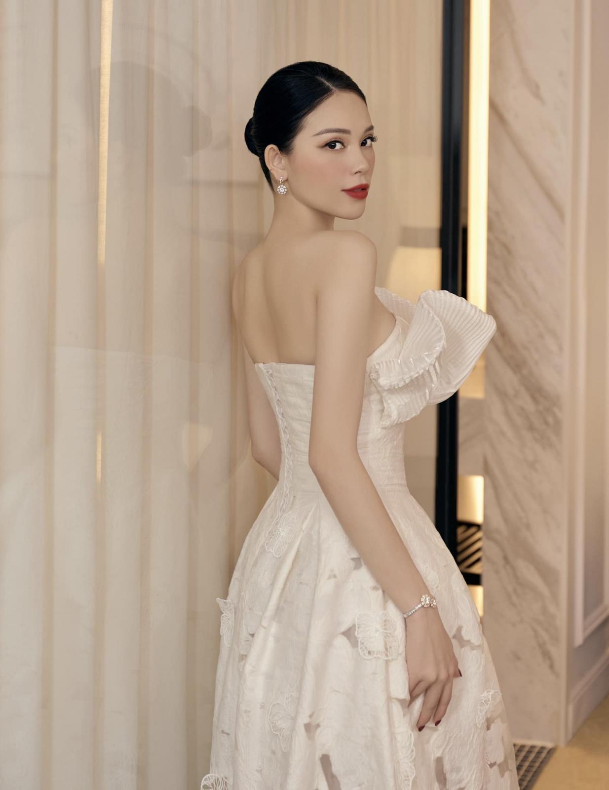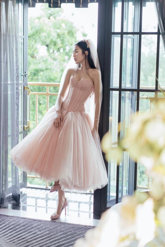Thấu hiểu gout thẩm mỹ cùng tư duy thời trang hiện đại của cô dâu, trang phục cưới được định hướng không đính kết cồng kềnh kim sa hay váy tầng phức tạp như những lựa chọn trang phục cưới thông thường, mà thay vào đó cấu trúc và phom dáng được tiết chế hài hoà, tinh tế để tập trung vào việc xử lý chất liệu điêu luyện cũng như chi tiết tạo hình thủ công độc đáo trên bề mặt vải.