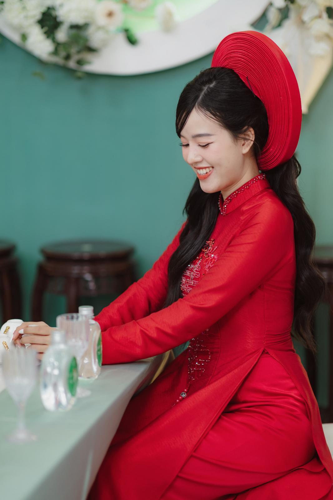Chân váy xòe rộng bồng bềnh, được may từ chất liệu cao cấp với họa tiết hoa nổi trải dọc theo tà váy, mang đến cảm giác như một bức tranh nghệ thuật lộng lẫy. Những đường nét cắt may chuẩn xác giúp tôn dáng người mặc, khiến cô dâu trông duyên dáng và kiêu sa như một nàng công chúa bước ra từ câu chuyện cổ tích.