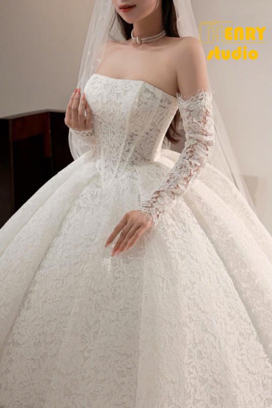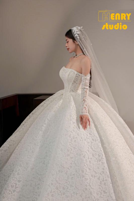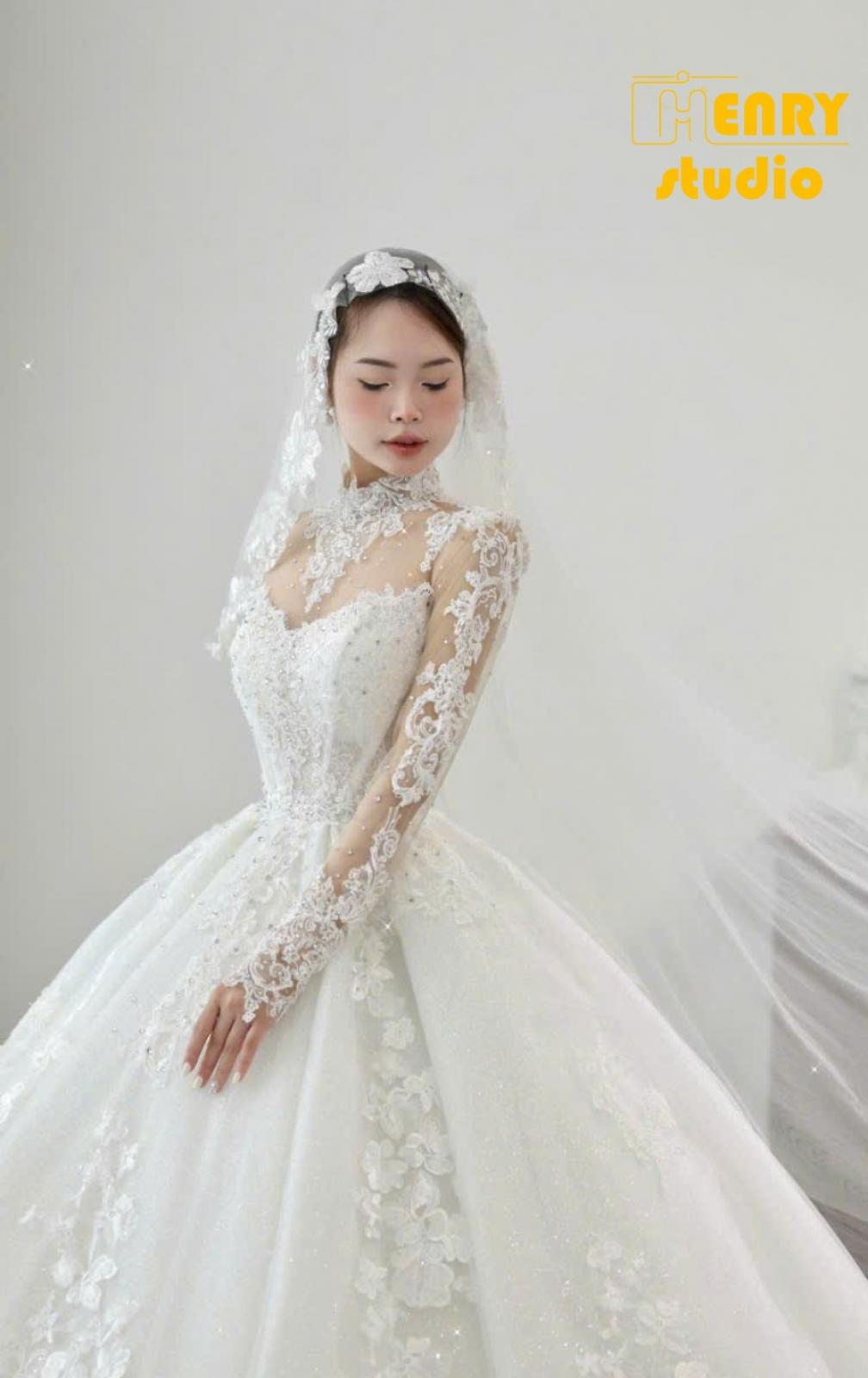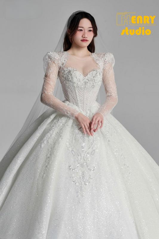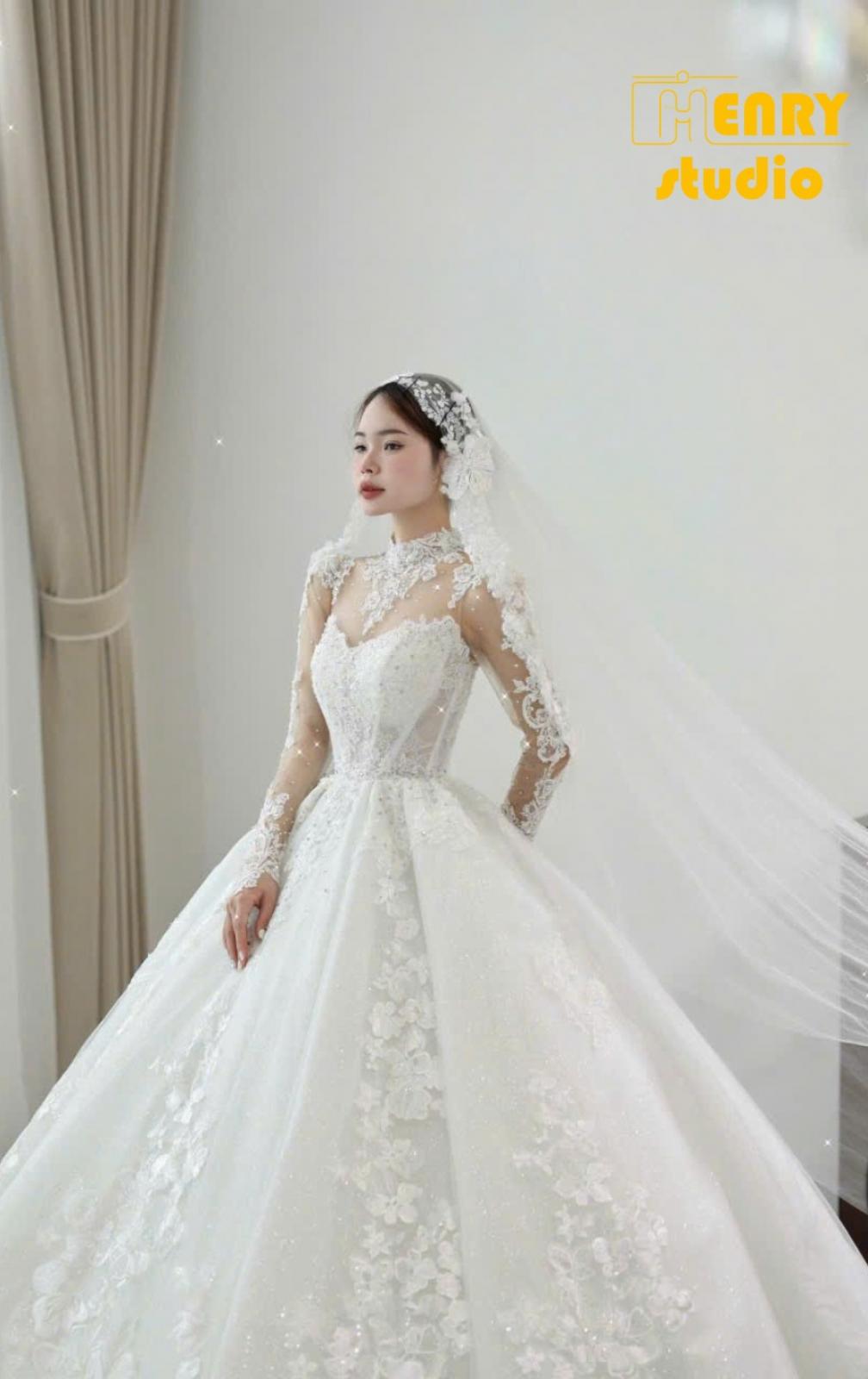 Thiết kế phom dáng hoàng gia với phần váy xòe bồng bềnh. Tay dài xuyên thấu kết hợp họa tiết đính kết tinh xảo, mang lại vẻ đẹp vừa thanh lịch vừa sang trọng. Điểm nhấn cúp ngực tinh tế, tôn lên nét quyến rũ và nữ tính. Mỗi chi tiết đều được chăm chút tỉ mỉ, giúp nàng dâu nhà 𝗛𝗲𝗻𝗿𝘆 𝗦𝘁𝘂𝗱𝗶𝗼 tỏa sáng như một nàng công chúa thực thụ trong ngày trọng đại của mình.