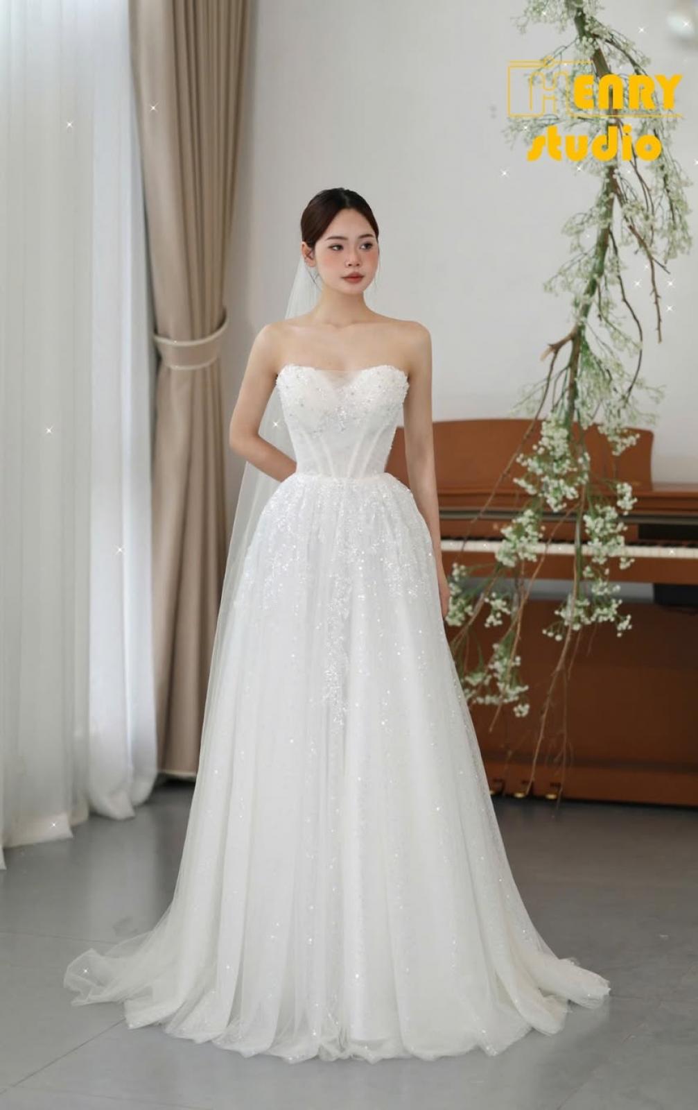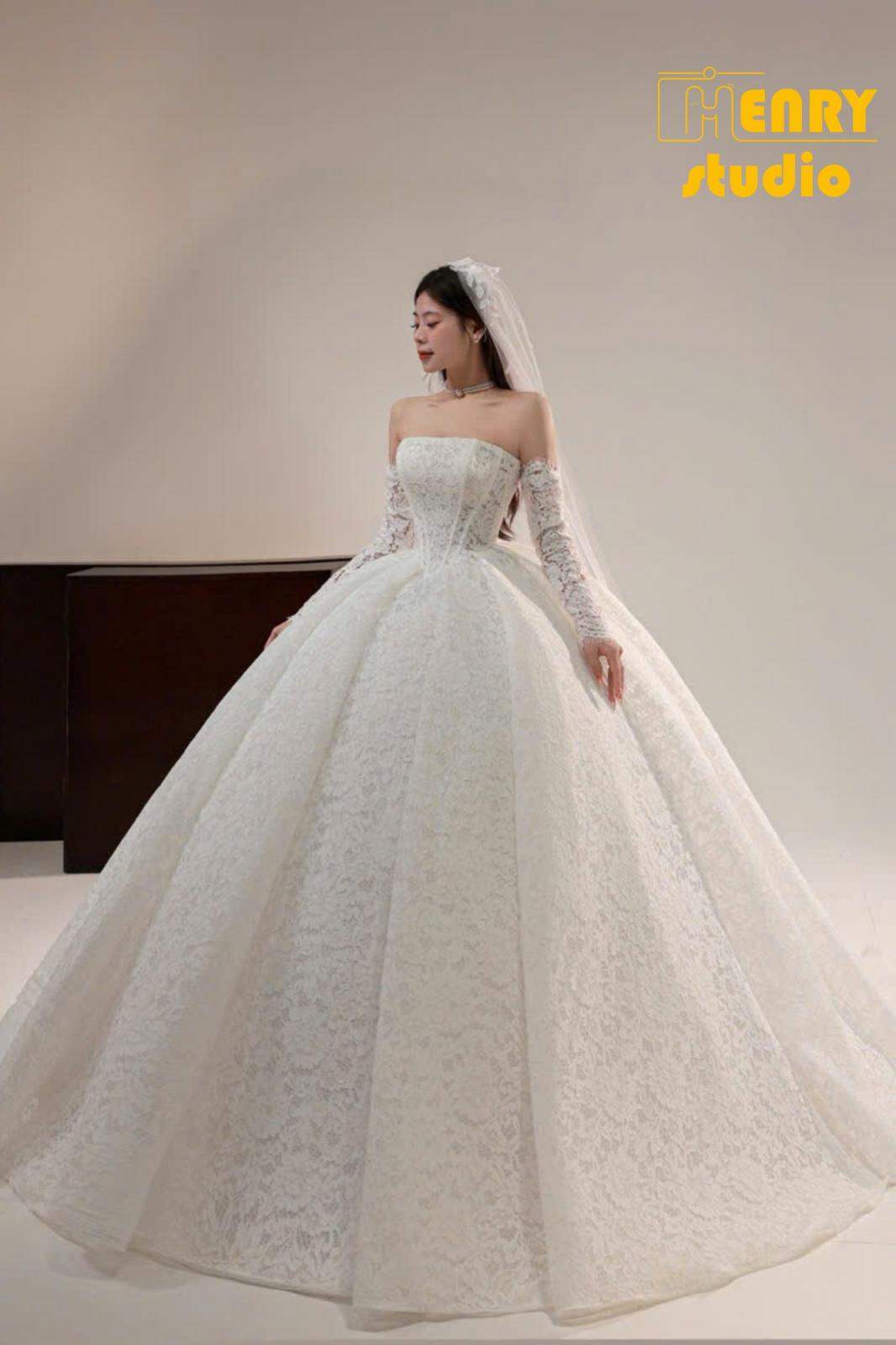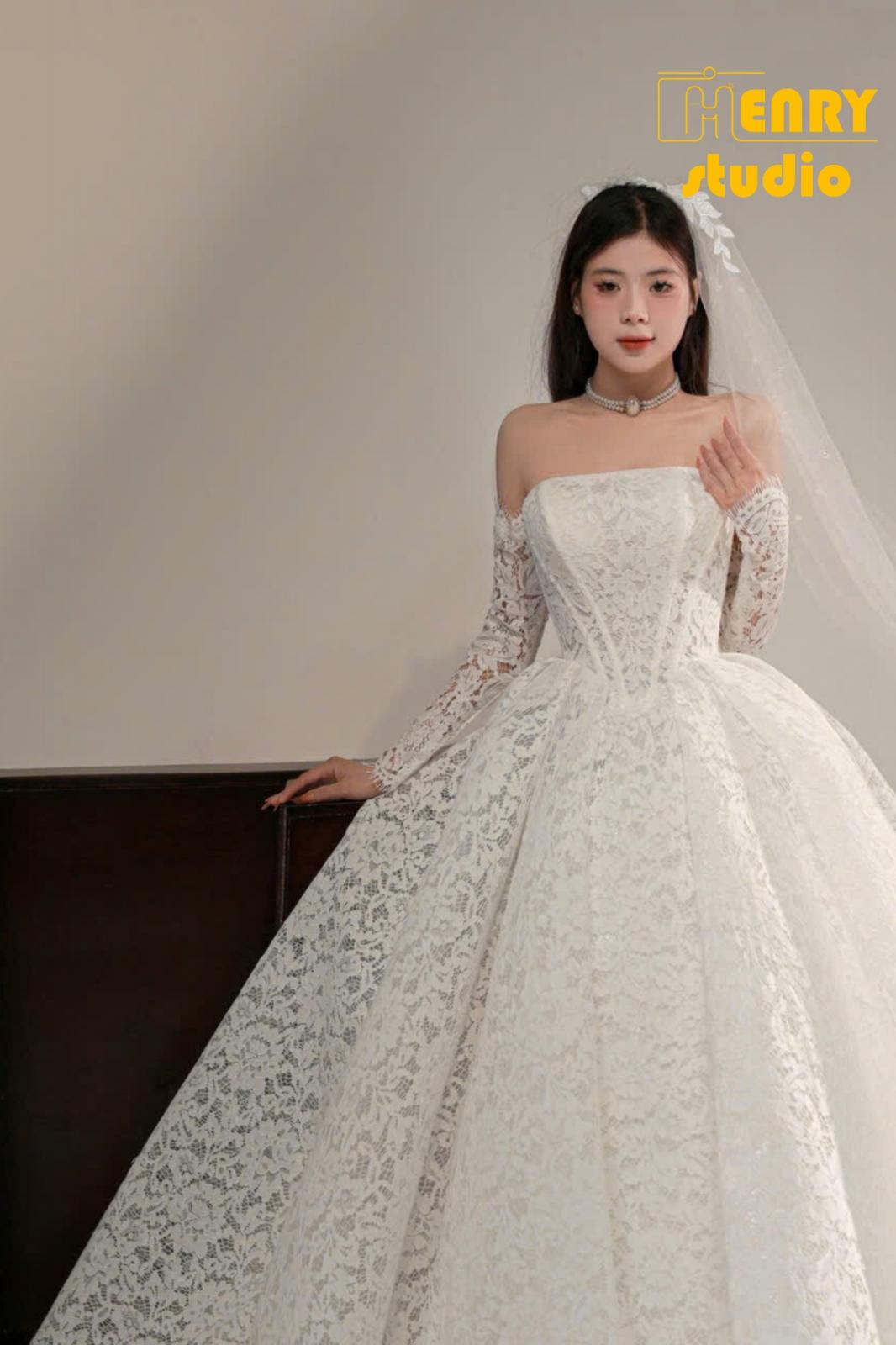 Thiết kế phom dáng hoàng gia với phần váy xòe bồng bềnh. Tay dài xuyên thấu kết hợp họa tiết đính kết tinh xảo, mang lại vẻ đẹp vừa thanh lịch vừa sang trọng. Điểm nhấn cúp ngực tinh tế, tôn lên nét quyến rũ và nữ tính. Mỗi chi tiết đều được chăm chút tỉ mỉ, giúp nàng dâu nhà 𝗛𝗲𝗻𝗿𝘆 𝗦𝘁𝘂𝗱𝗶𝗼 tỏa sáng như một nàng công chúa thực thụ trong ngày trọng đại của mình.