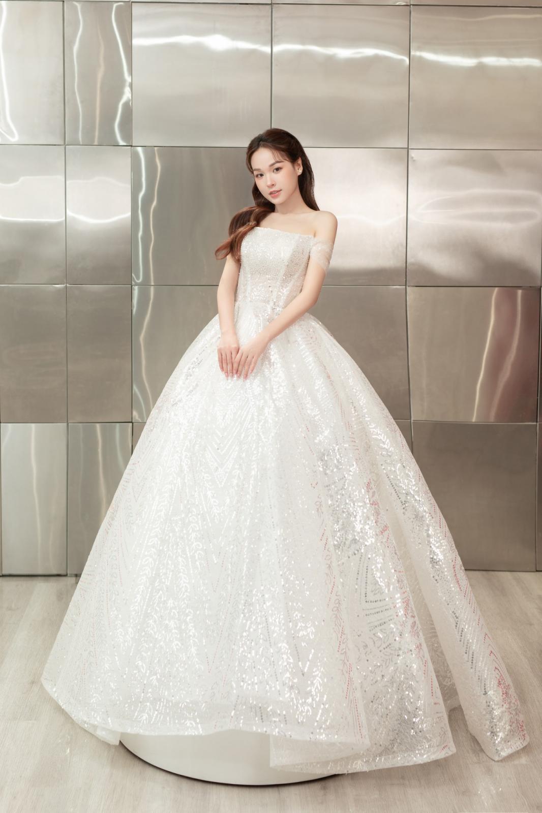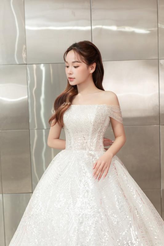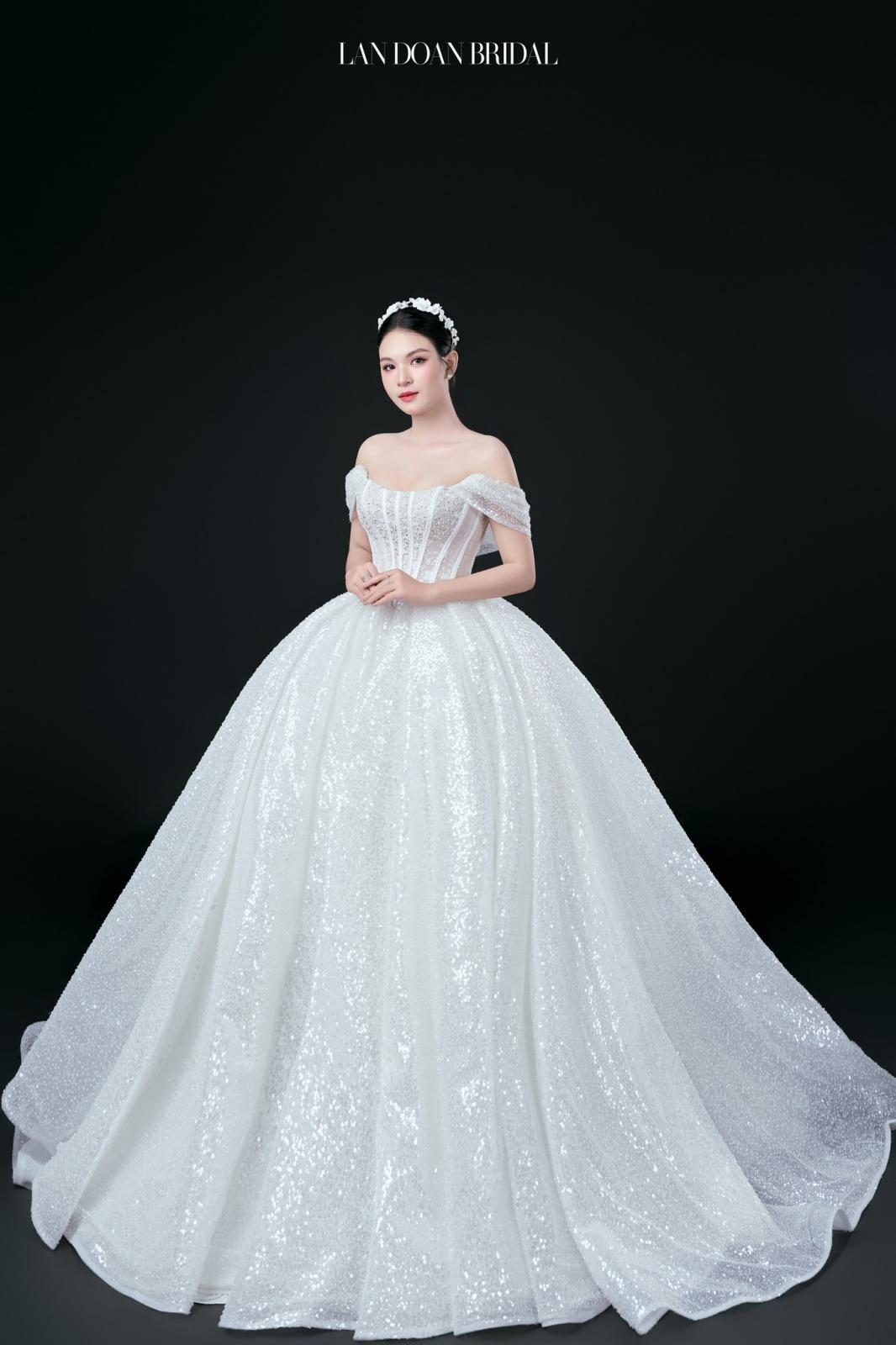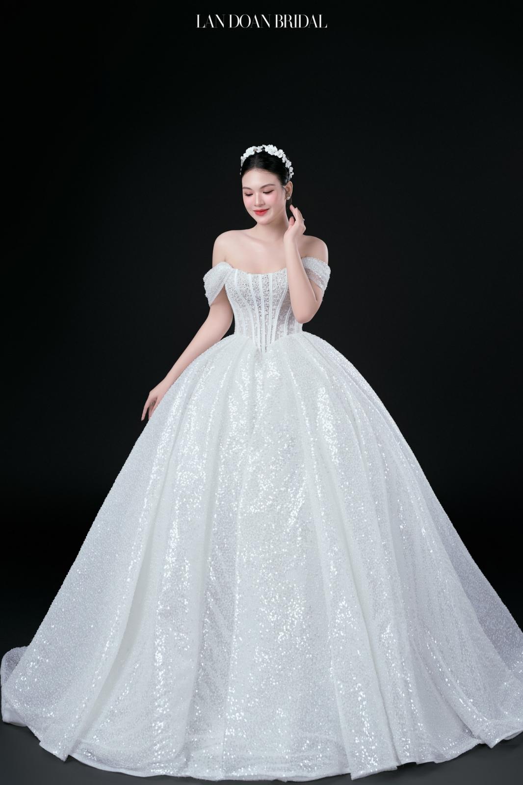 Mẫu váy cưới trễ vai của Lan Doan mang đến sự kết hợp hoàn hảo giữa vẻ đẹp dịu dàng và hiện đại. Thiết kế trễ vai giúp nàng dâu che khéo bắp tay, tôn lên vẻ đẹp mềm mại và quyến rũ. Họa tiết lấp lánh cùng ánh kim tinh xảo làm tăng thêm sự nổi bật, giúp cô dâu trở nên lộng lẫy trong ngày trọng đại.