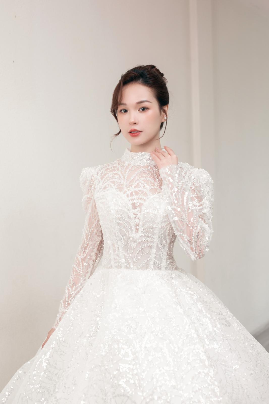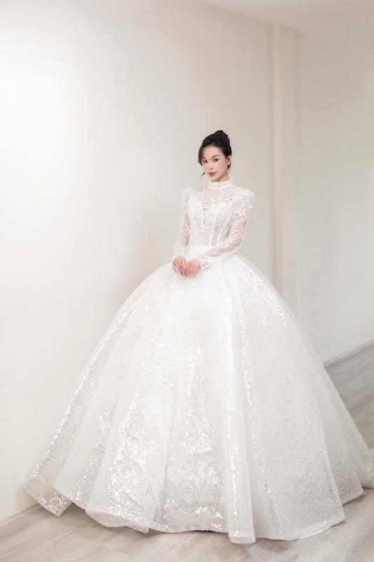 Mẫu váy cưới tay dài, kín cổ mang đến sự kín đáo và sang trọng, được thiết kế tinh xảo với chất liệu kim sa lấp lánh, tạo hiệu ứng bắt sáng đầy cuốn hút. Phom váy xòe bồng giúp nàng dâu tỏa sáng như một nàng công chúa trong ngày trọng đại.