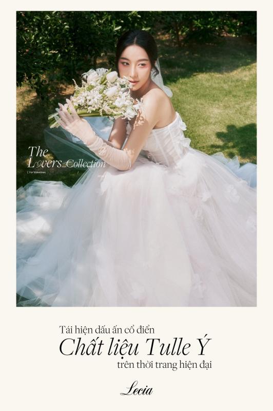 Một trong những dấu ấn của Lecia về sự quý phái, lộng lẫy song vẫn rất thanh lịch chính là chất liệu Tulle bay bổng được xử lí kì công trên mỗi sản phẩm.