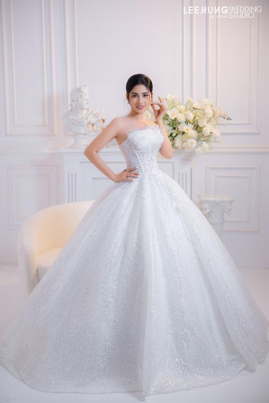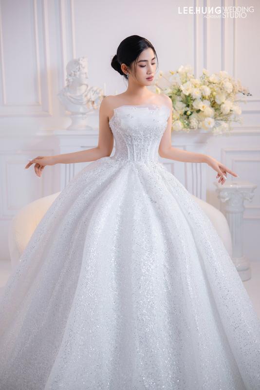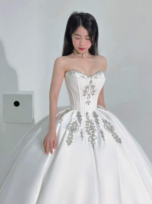 Chiếc váy cưới nổi bật với thiết kế váy bồng bềnh, mang đến vẻ đẹp lôi cuốn và quý phái. Phần chân váy dài, làm từ satin, tạo nên sự sang trọng với độ bồng bềnh hoàn hảo, được trang trí tỉ mỉ bằng những họa tiết lấp lánh cùng thêu tinh xảo, giúp tôn lên vẻ đẹp của người mặc một cách ấn tượng. mang đến1