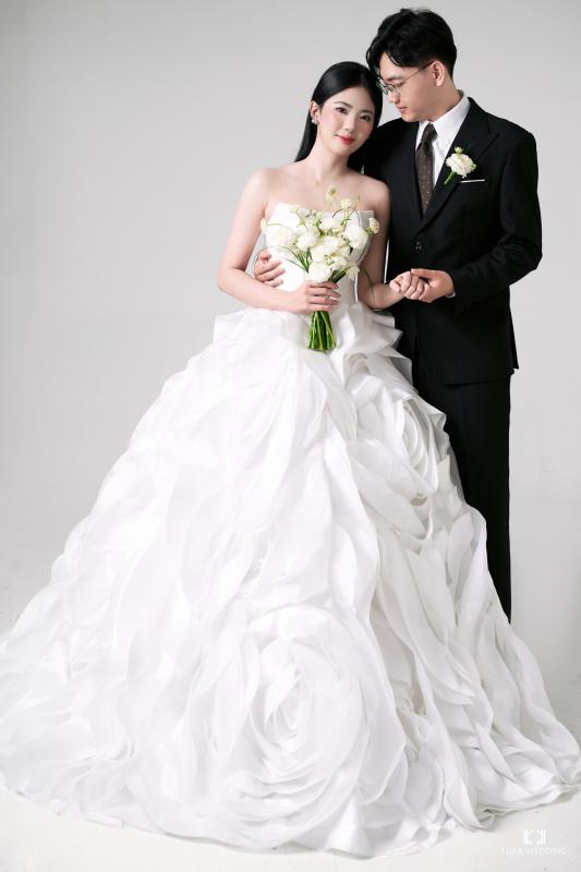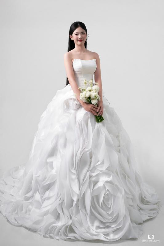 Vẫn là thiết kế strapless kinh điển, Luka Wedding mang đến 'làn gió mới' cho cô dâu hiện đại với phần tùng váy được xử lý độc đáo. Tựa như một đoá hoa rực rỡ, mở ra một khu vườn để nàng được đắm chìm trong vẻ đẹp của riêng mình, bộ cánh giúp cho diện mạo của cô dâu trở nên đặc sắc hơn bao giờ hết. Cùng với bộ ảnh cưới của cô dâu với phông nền tối giản, thiết kế ball-gown này càng giúp cho bộ ảnh cưới của cô dâu trở nên nổi bật. Tôn vinh được cá tính & nét độc bản của cô dâu.
