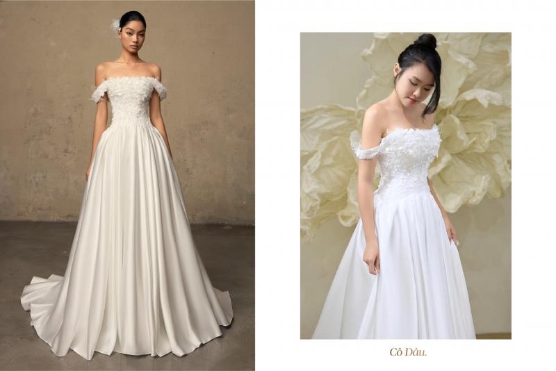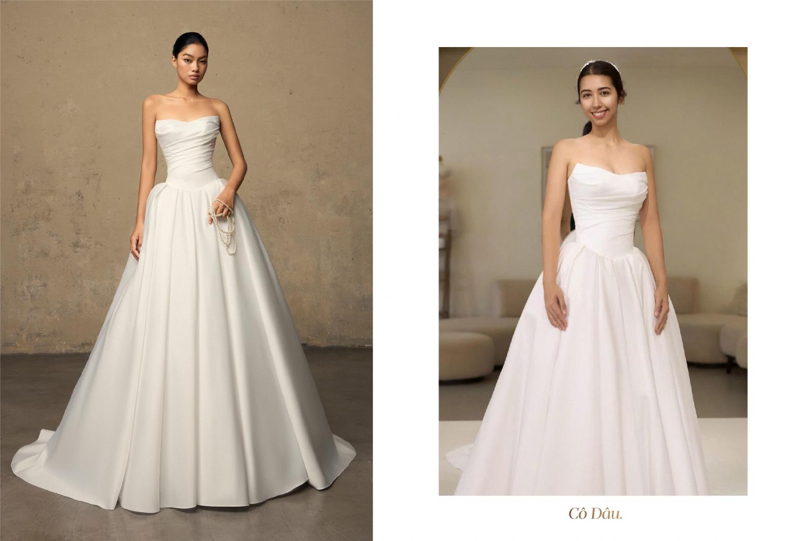 Song từng đường xếp vải không chỉ tạo chiều sâu thị giác mà còn mang hơi thở của sự thủ công tinh tế, tất cả hoà quyện để mang lại vẻ nữ tính, yêu kiều nhưng vẫn giữ được tinh thần timeless, tối giản mà chính các nàng dâu hiện đại luôn tìm kiếm.