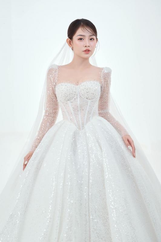 Lớp choàng voan bồng bềnh mang đến sự nhẹ nhàng như nàng công chúa bước ra từ câu chuyện cổ tích.