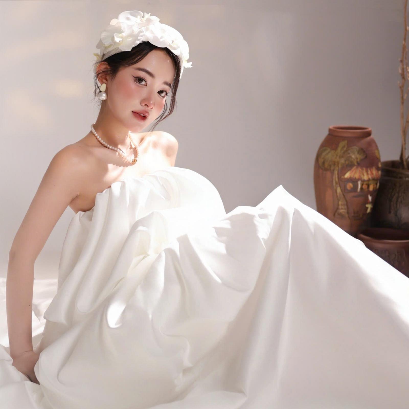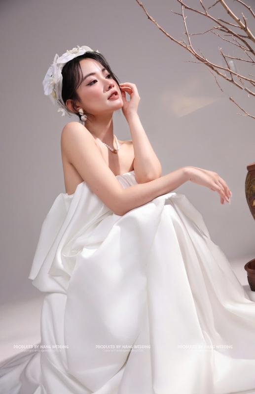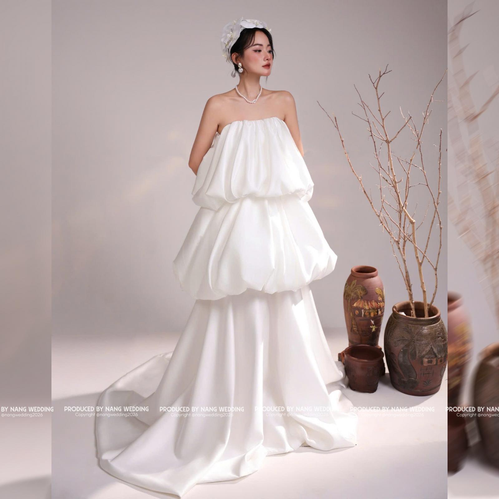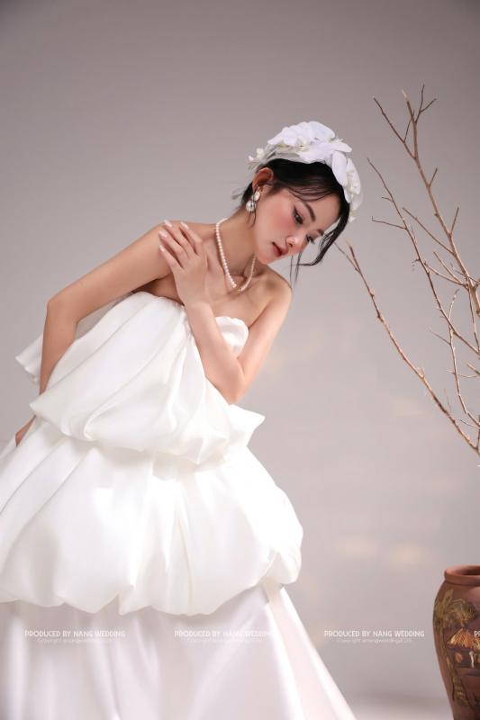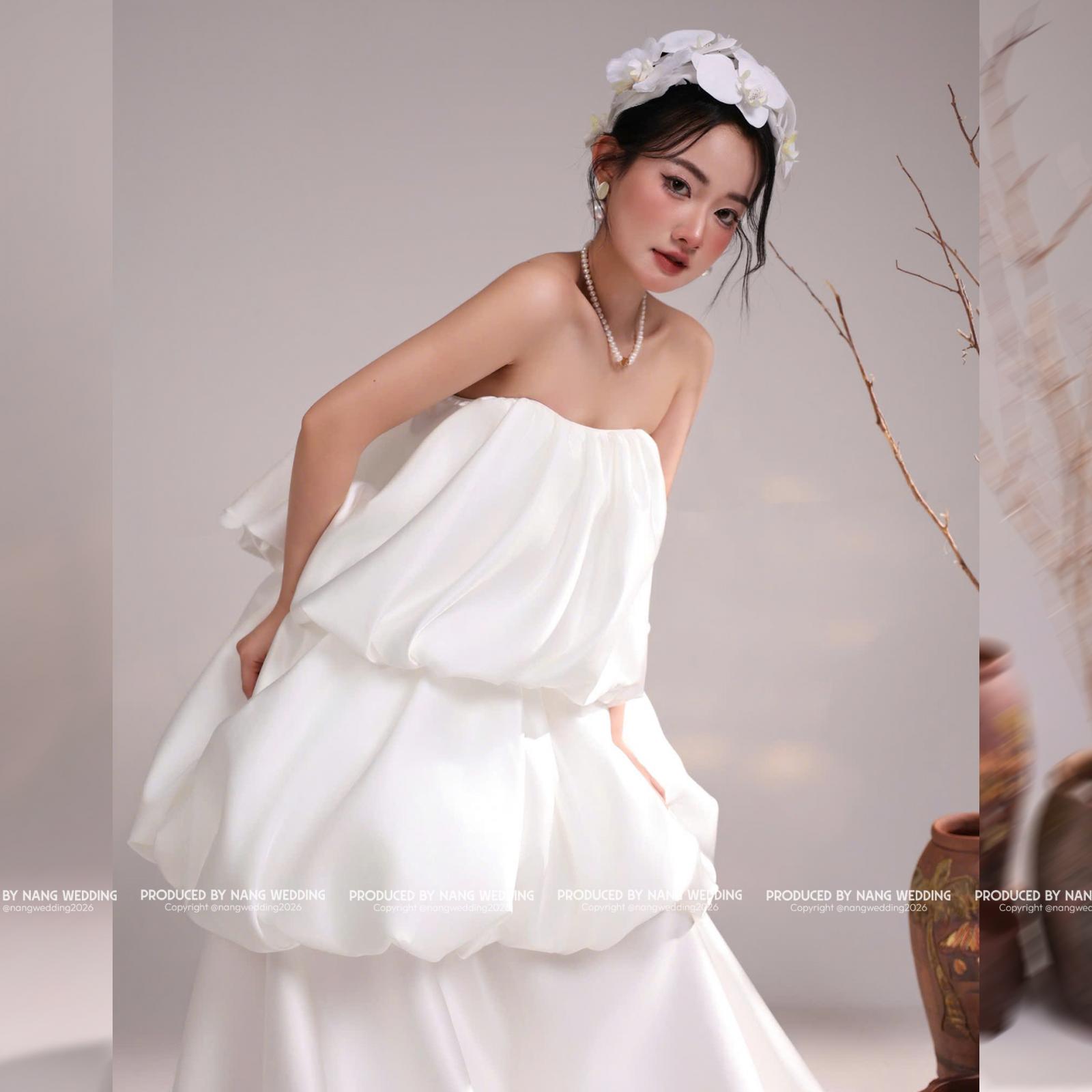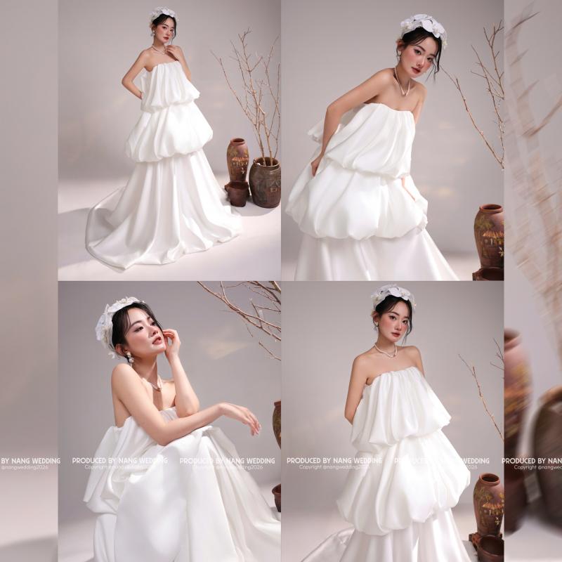 Form váy bồng bubble với các tầng phồng mềm mại, tạo hiệu ứng bay bổng tự nhiên. Thiết kế tối giản, không phô trương chi tiết nhưng vẫn tôn lên nét nữ tính, nhẹ nhàng và thời trang cho cô dâu.