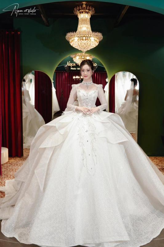 Mẫu váy được thiết kế tay dài kết hợp cùng phần cổ cao tạo sự trang trọng và kiêu sa cho các nàng dâu trong ngày trọng đại. Bên cạnh thiết kế trang trọng, mẫu váy này còn được những đôi bàn tay kéo léo đính kết thủ công từng hạt , từng mảng ren lên phần thân áo góp phần tạo thêm sự lấp lánh và nổi bật trong khoảnh khắc thiên liêng nhất của đời mình.
